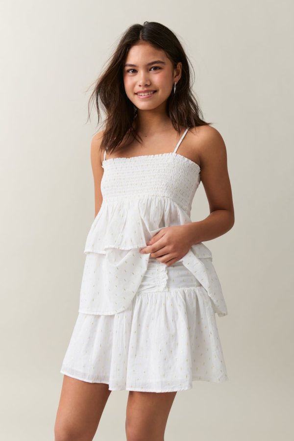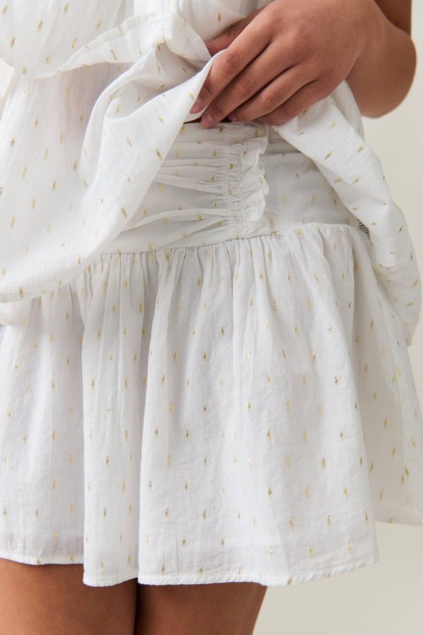 Kort kjol med låg midja. Kjolen är vit och har rynkad söm upptill.