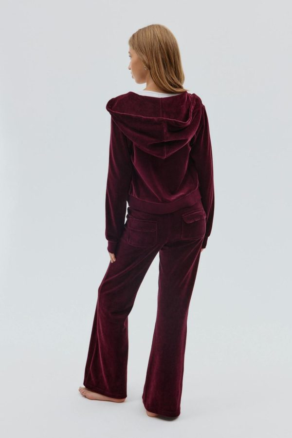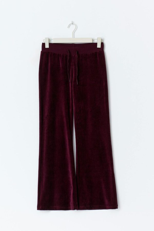 Velourbyxa med en normalhög midja. Byxan är vinröd och har en fullängd. Den har fickor med lock baktill med en knapp och ett elastiskt midjeband.