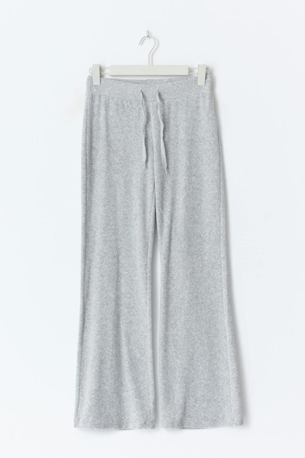 Tall velourbyxa med en normalhög midja. Byxan är i ljusgrå melange och har en fullängd. Den har fickor med lock baktill med en knapp och ett elastiskt midjeband. Passar för dig som är 175 cm eller längre.
