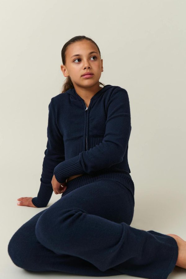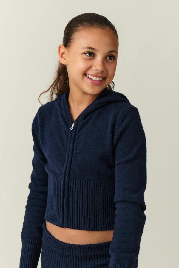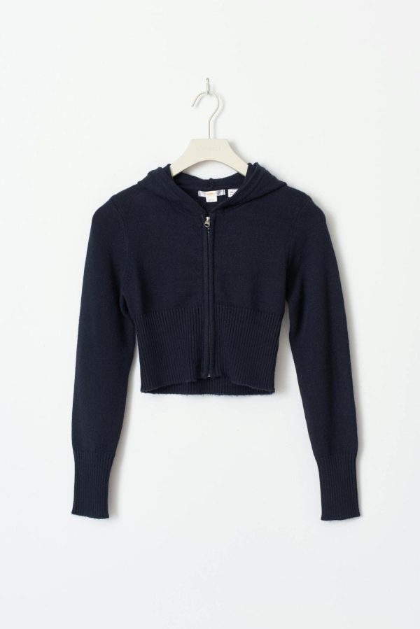 Stickad hoodie med bred, ribbad mudd vid ärmslut och i nederkant. Hoodien är blå, långärmad och croppad och har huva bak.