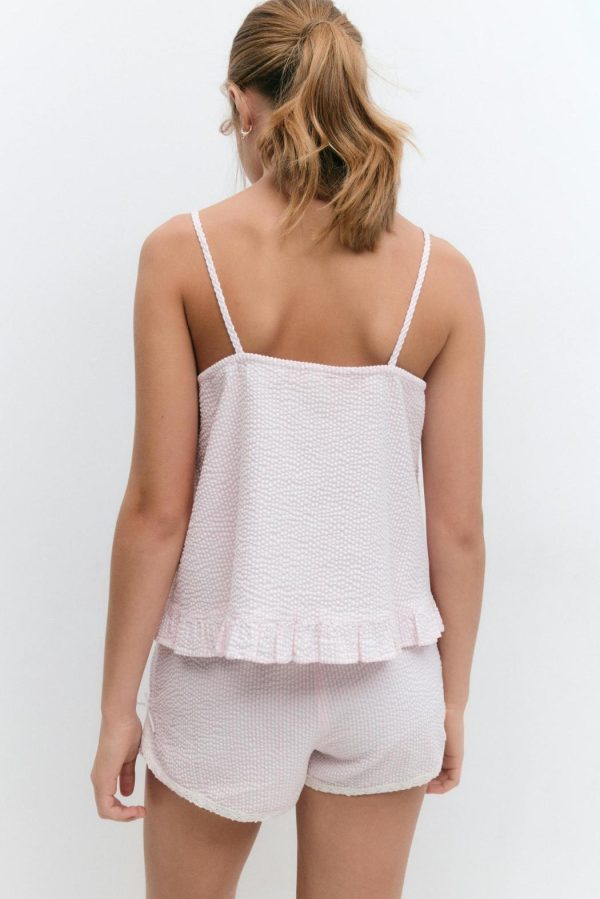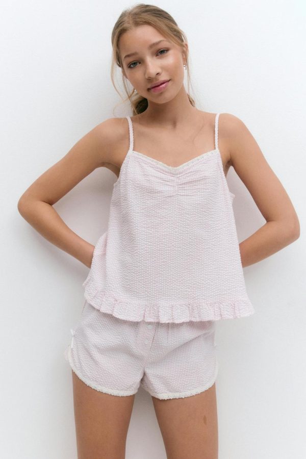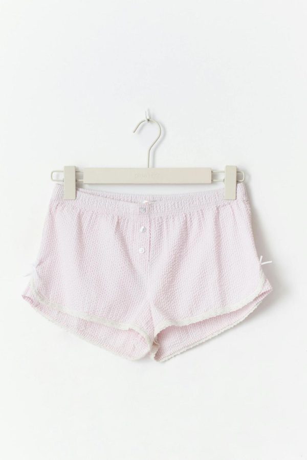 Korta shorts i bomull med en låg midja. Shortsen är rosa, vita och mjuka och har en normal passform. De har en resår i midjan, knappdetaljer framtill, en rosettdetalj på sidorna och en rundad spetsdetaljerad kant.