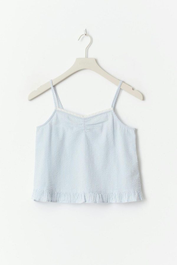 Kort linne i bomull med en v-ringning. Linnet är blått och vitt och har generös passform. Det har en liten rynkad söm fram, en spetskant fram, en nedervolang och mjuk seersucker-kvalitet.