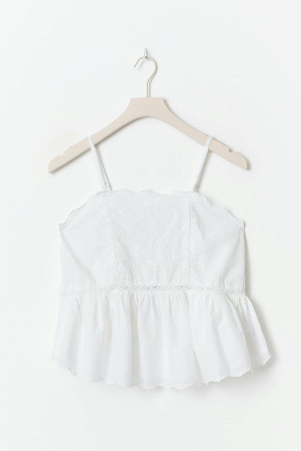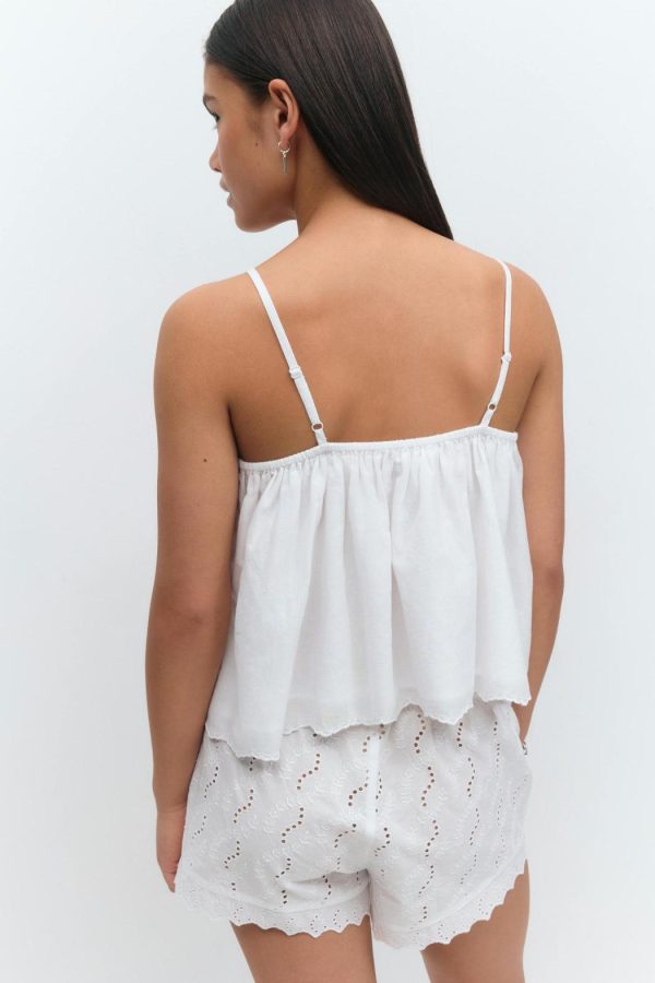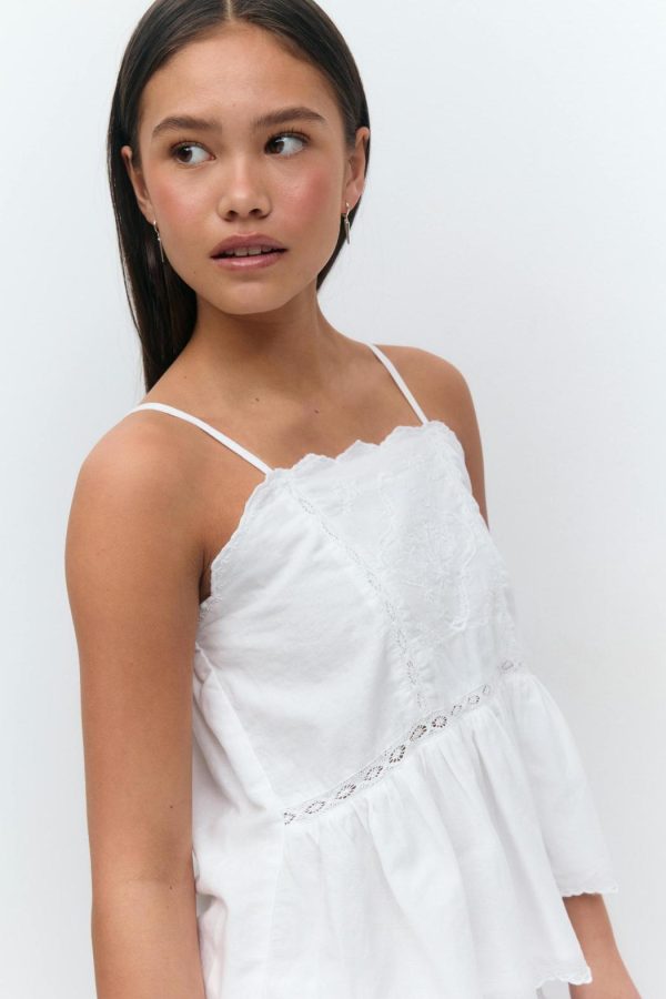 Broderat linne i bomull med spetsdetalj framtill. Linnet är vitt och har oversize fit. Det har tunna, justerbara axelband, rynkningar framtill och croppad längd.