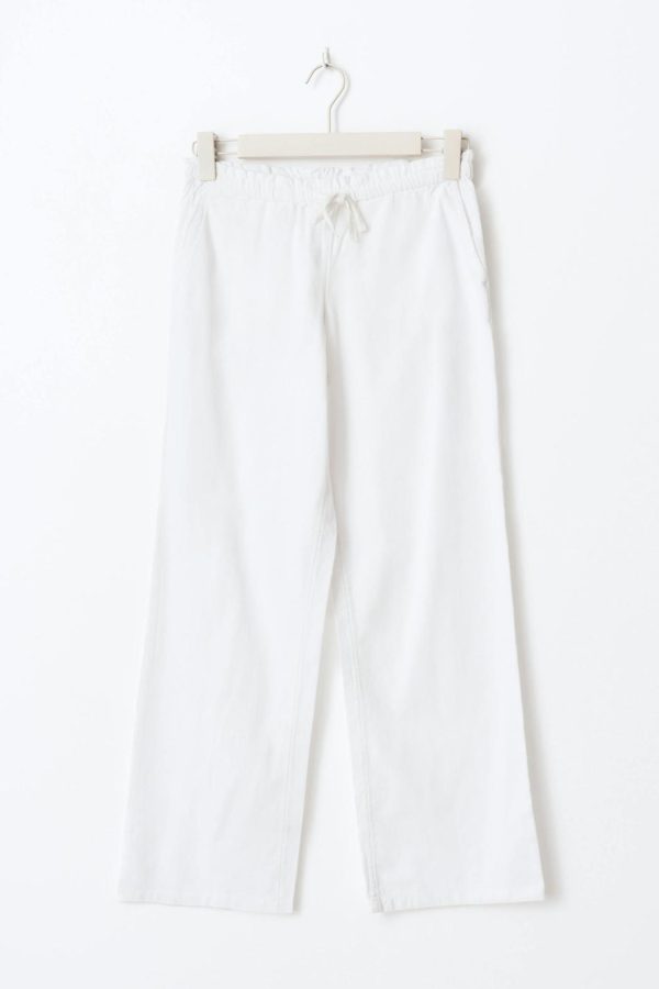 Linnebyxor med extra långa ben. Byxorna är vita och har låg midja. De har ett elastiskt midjeband och fickor på sidorna och baktill.