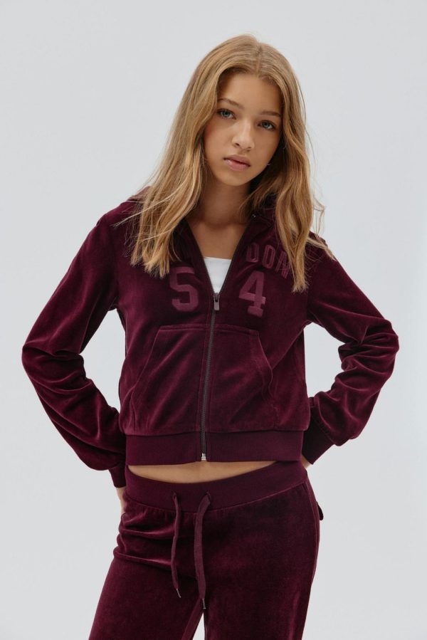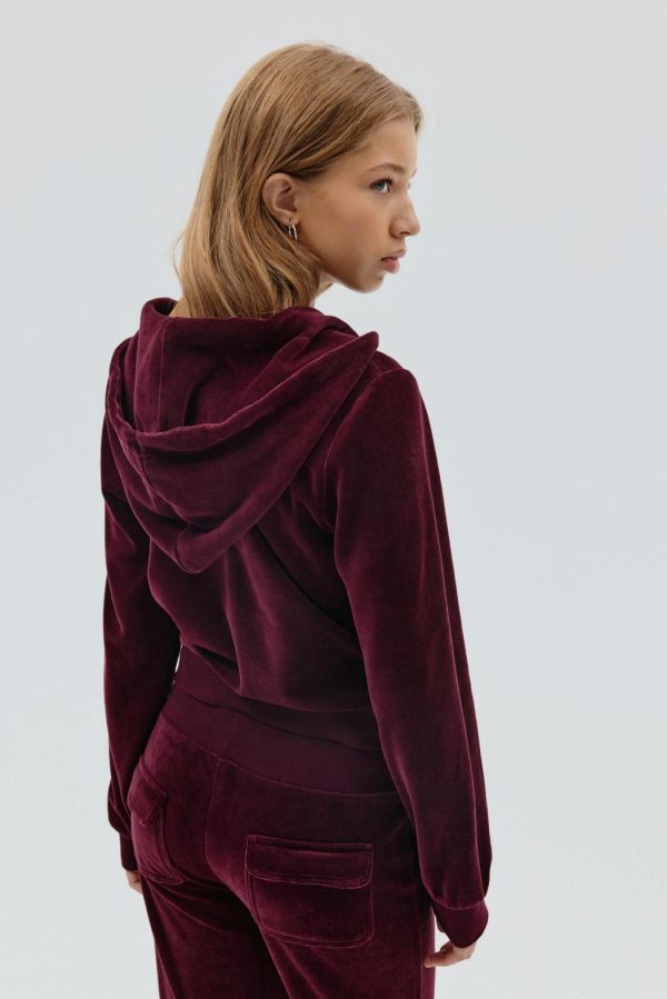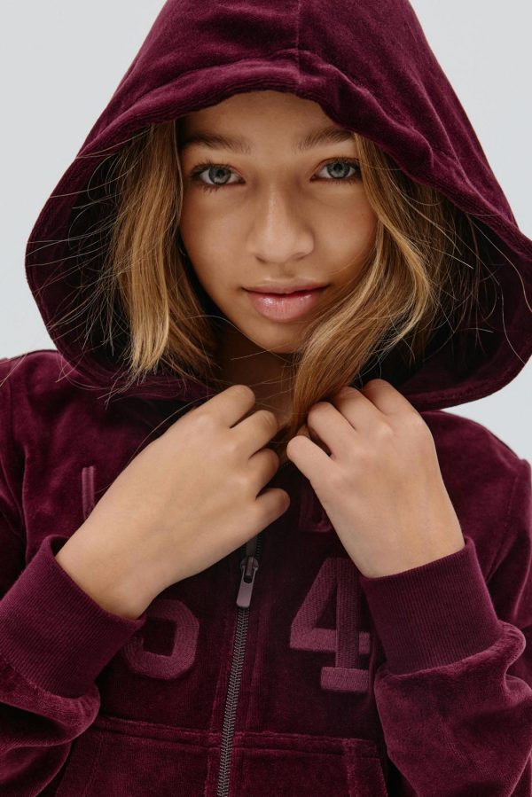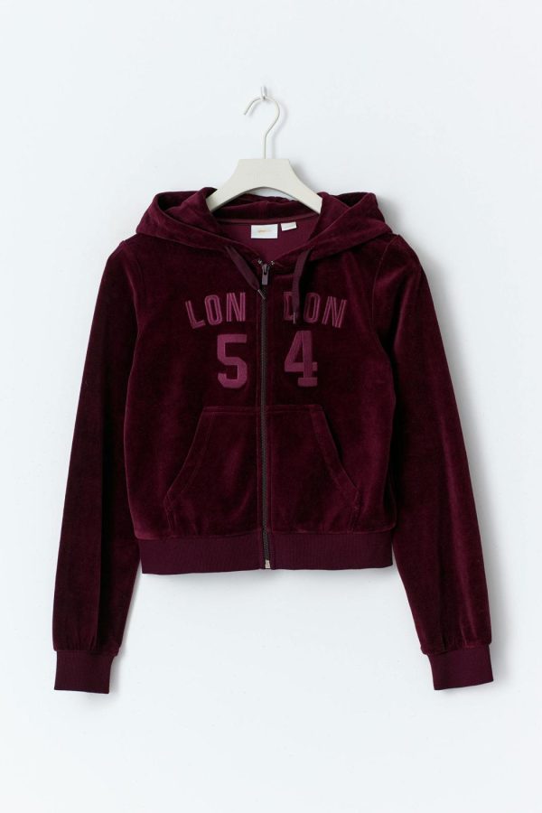 Hoodie i velour med broderi framtill. Hoodien är vinröd och har huva med dragskor. Den har dragkedja fram, fickor, långa ärmar och ribbad mudd vid ärmslut och i nederkant. Tryck: London.