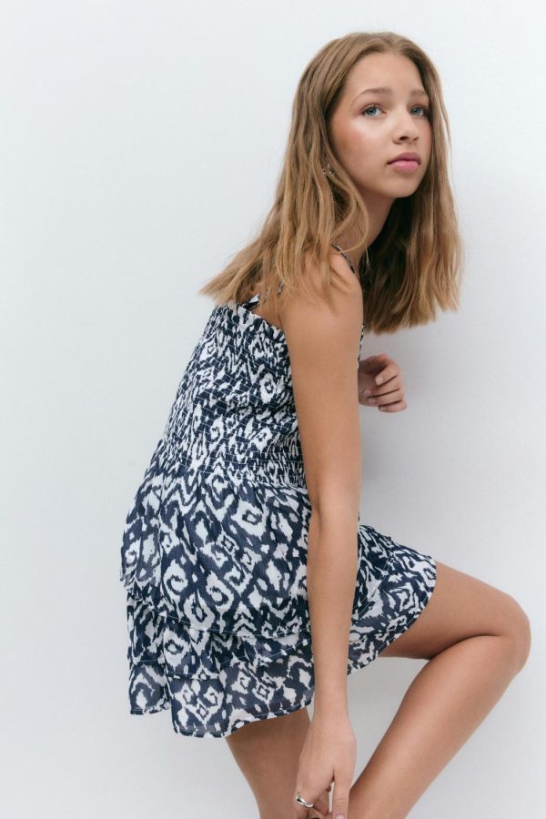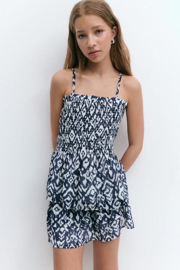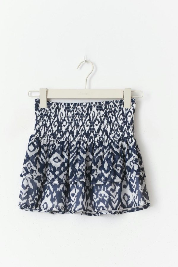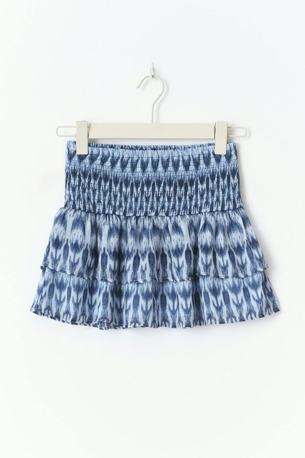 Mönstrad kjol med volanger. Kjolen är blå och kort och har en smockad midja.