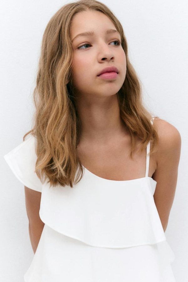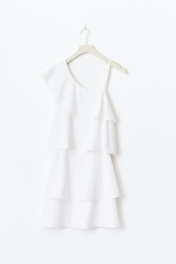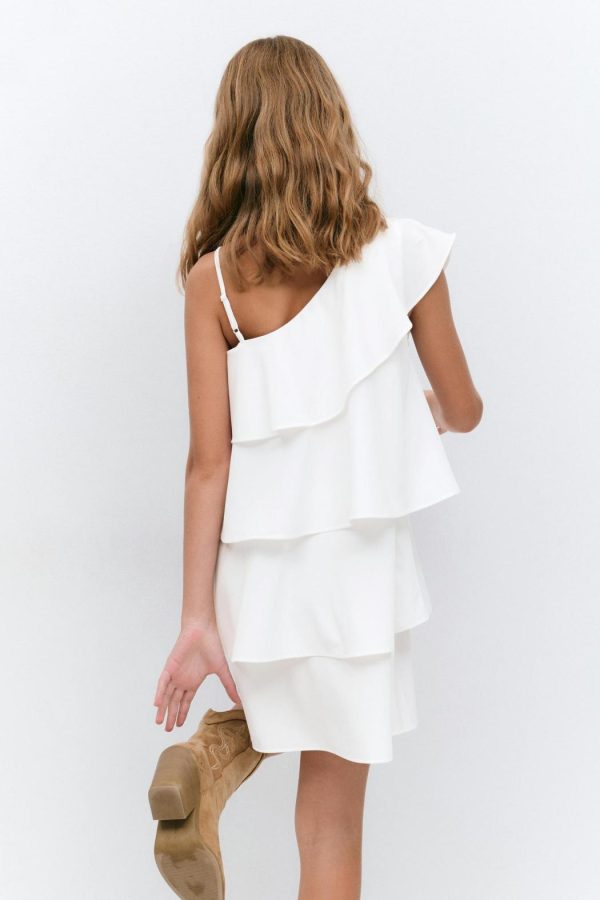 Kort one shoulder-klänning med volanger. Klänningen är vit och har reglerbart axelband.