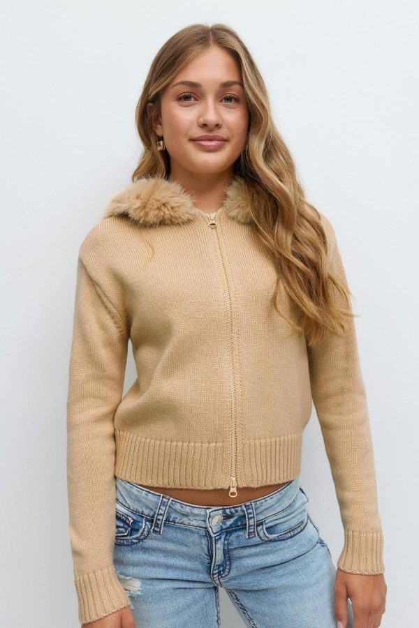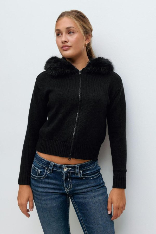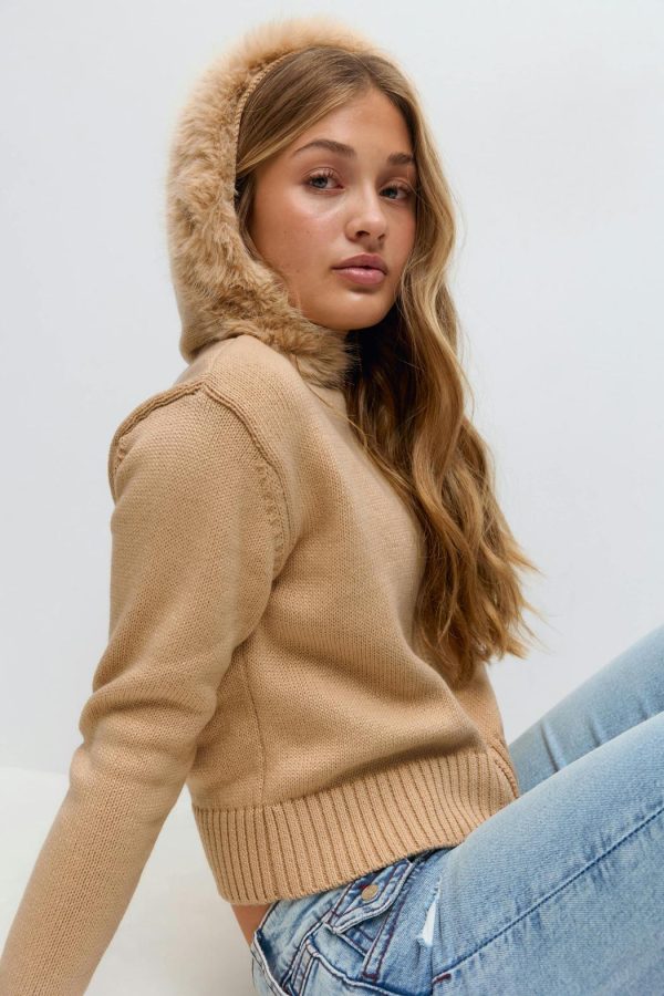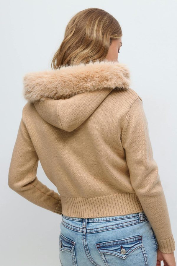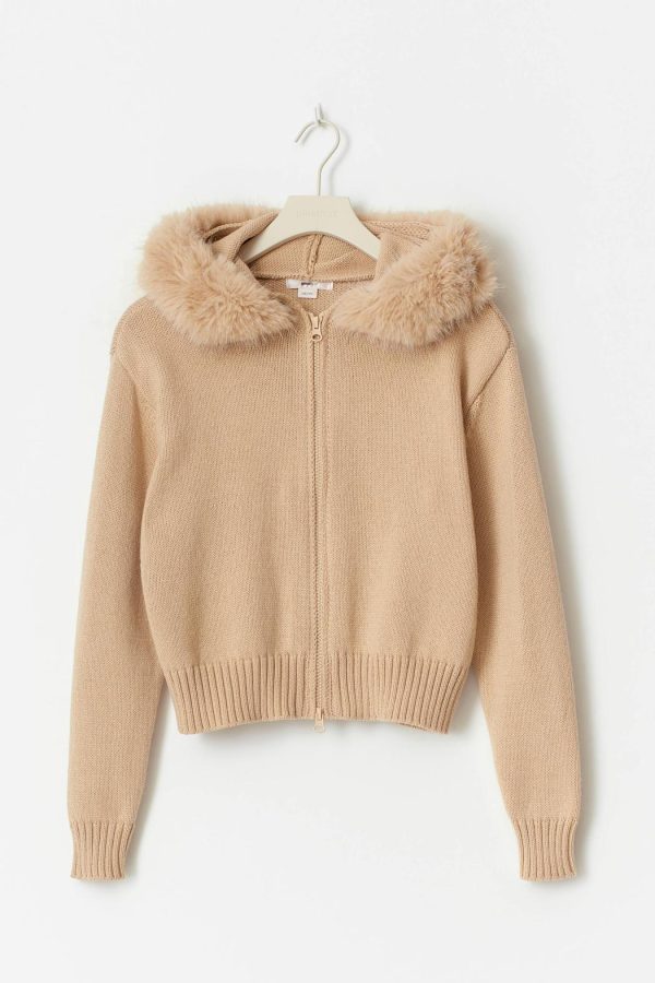 Stickad hoodie med figurnära passform. Hoodien är beige och har huva med fuskpäls. Den har lång ärm, croppad längd, tvåvägsdragkedja framtill och ribbmudd vid ärmslut och i nederkant.