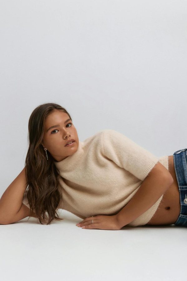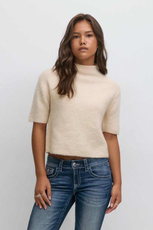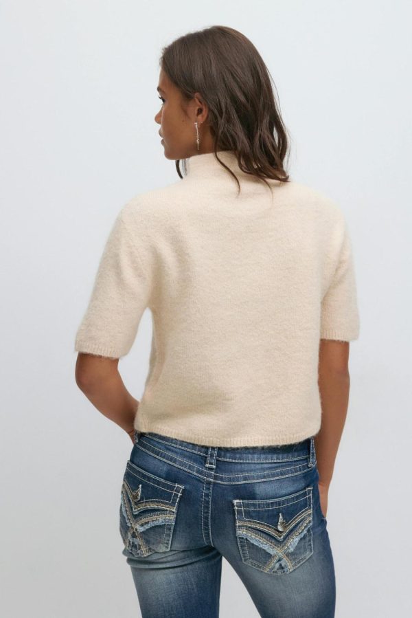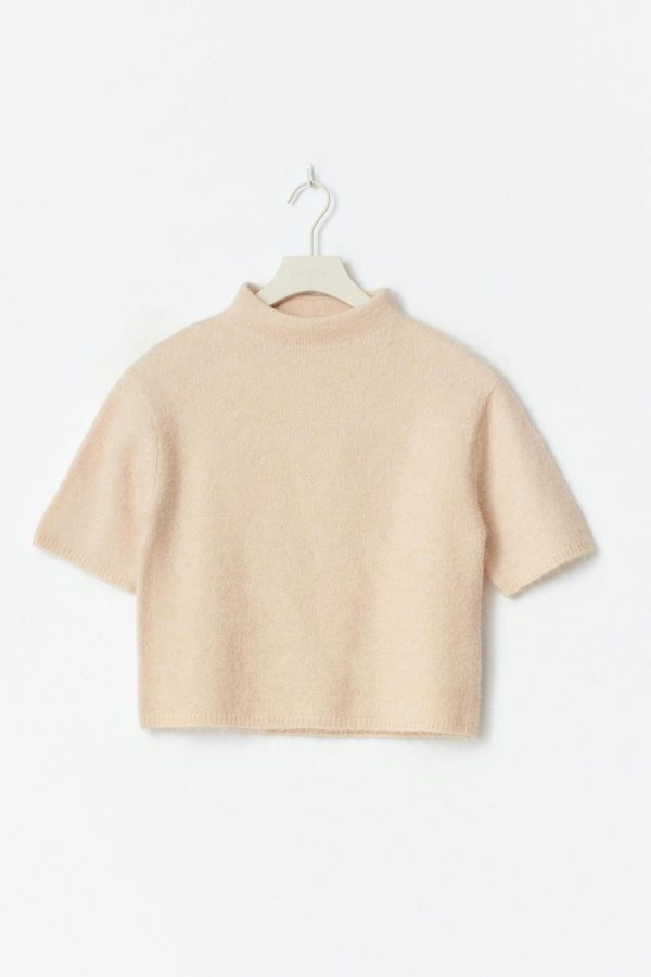 Kortärmad stickad tröja med hög krage. Tröjan är beige och har ribbstickning vid ärmslut och i nederkant.