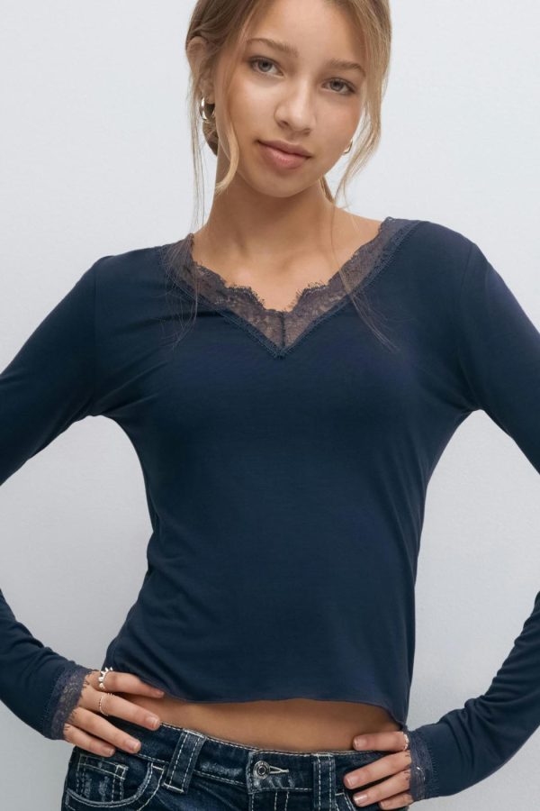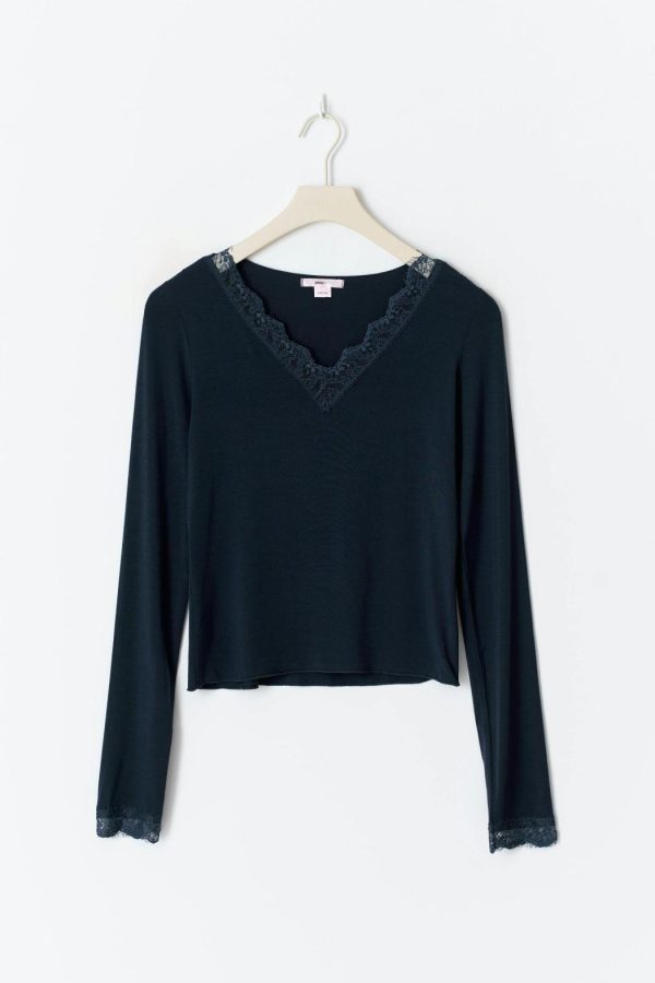Topp med spets kring halsringning och vid ärmsluten. Toppen är marinblå och har långa ärmar. Den har v-ringning och normal passform.