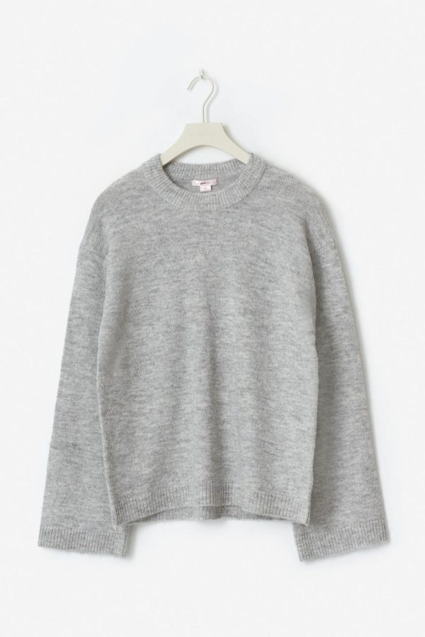 Stickad tröja med oversize fit. Tröjan är grå och har rund halsringning. Den har långa, raka ärmar, normallängd och ribbstickning vid ärmslut och i nederkant.