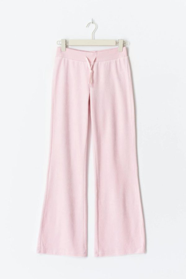 Tall velourbyxor med normalhög midja. Byxorna är rosa och har fullängd. De har fickor med lock baktill med en knapp och elastiskt midjeband. Passar för dig som är 175 cm eller längre.