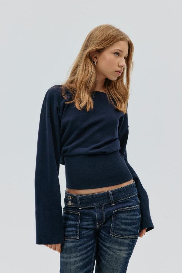 Stickad tröja med djup rygg. Tröjan är marinblå och har figurnära midja. Den har hög halsringning, långa, vida ärmar, ribbstickad nederkant och normal passform.