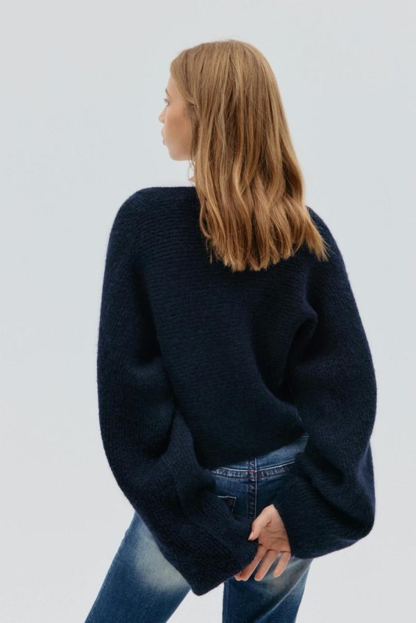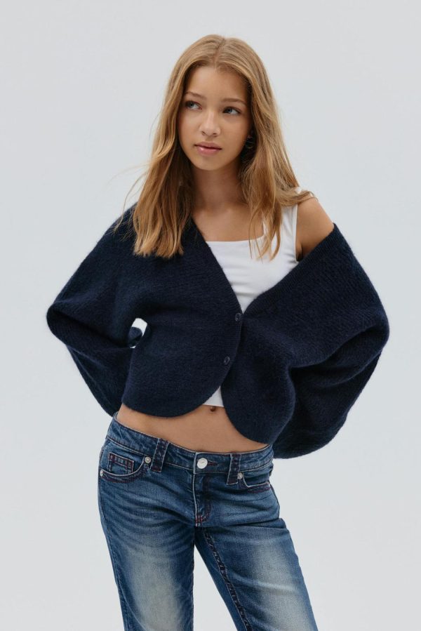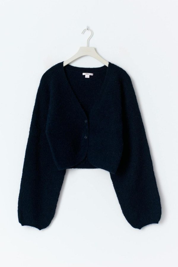 Stickad bolero med knappar framtill. Boleron är marinblå och har långa ärmar. Den har normal passform, rund halsringning och ribbstickning vid ärmslut och i nederkant.