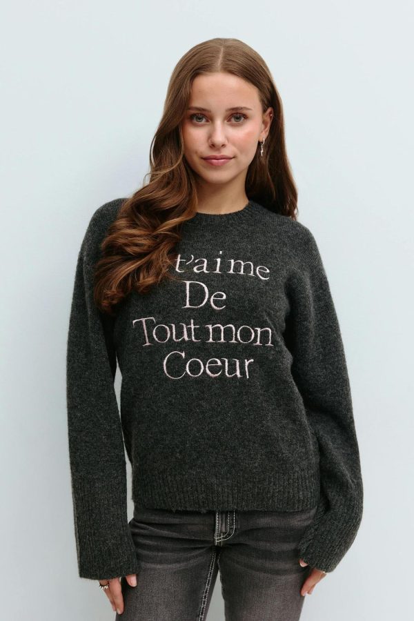 Stickad tröja med broderad text fram. Tröjan är grå och har rund halsringning. Den har normal passform, lång ärm och ribbstickning vid ärmslut och i nederkant.