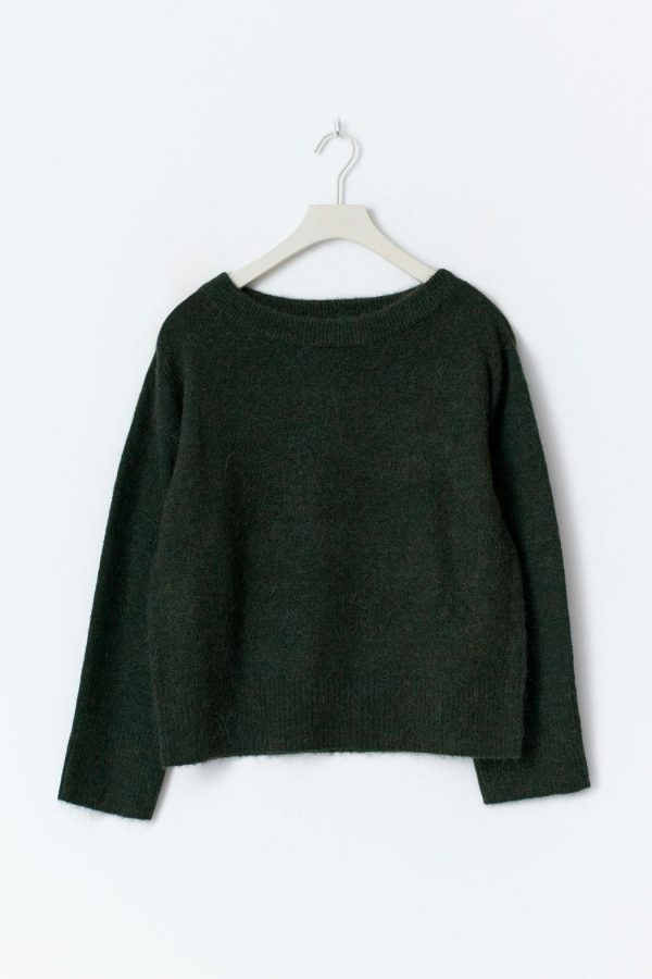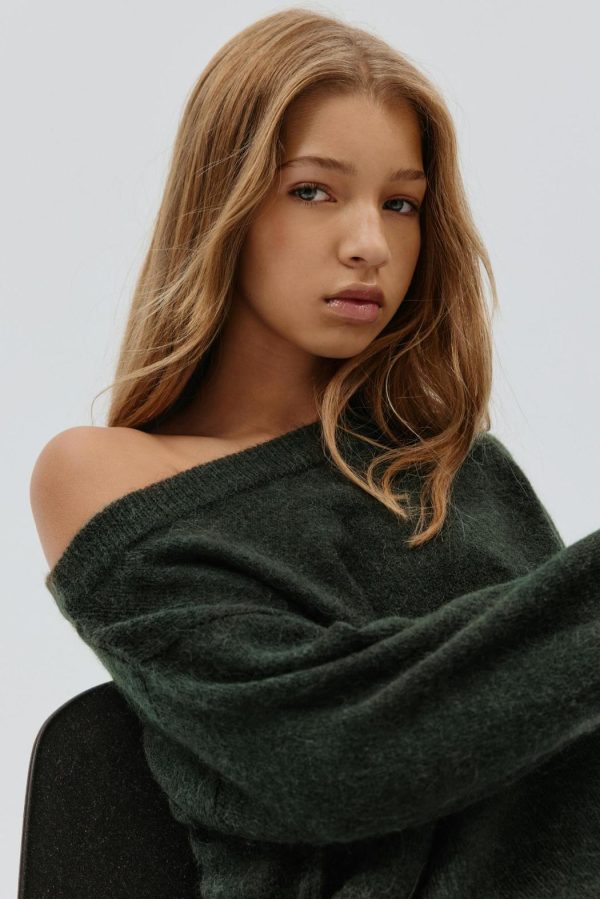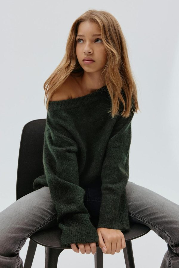 Stickad off shoulder-tröja med oversize fit. Tröjan är grön och har rund halsringning. Den har långa ärmar, ribbad nederkant och normallängd.