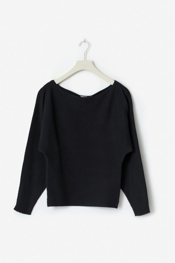 Stickad tröja med figurnära midja. Tröjan är blå och har båtringning. Den har mjuk, ribbstickad kvalitet, fladdermusärmar och croppad längd.