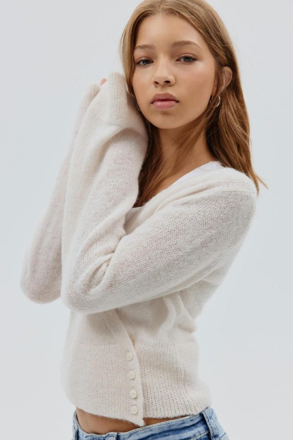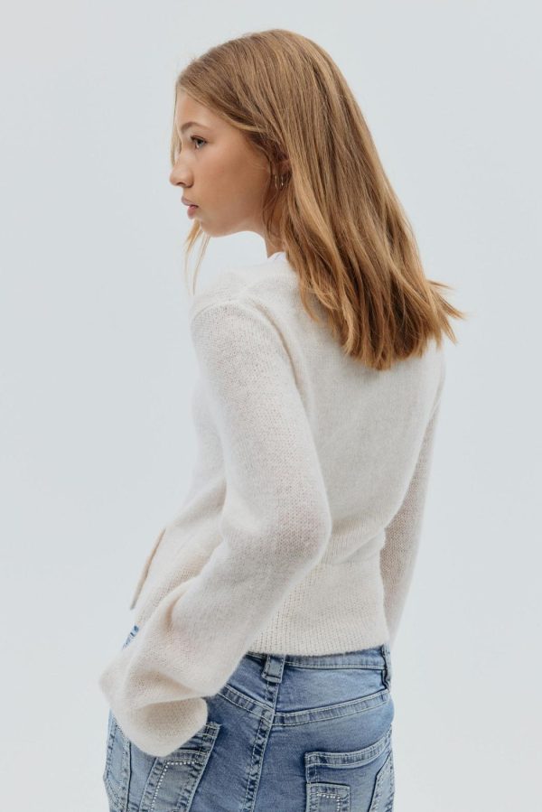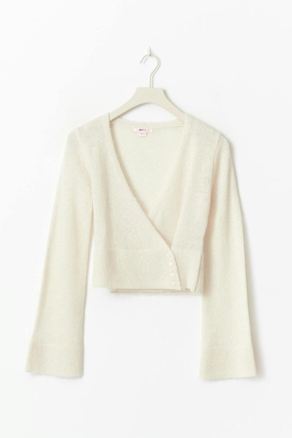 Stickad tröja med omlottdesign. Tröjan är vit och har croppad längd. Den har v-ringning, lång ärm, knappar framtill, normal passform och ribbstickade kanter.