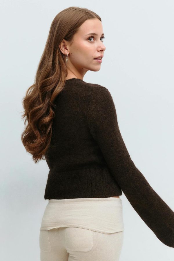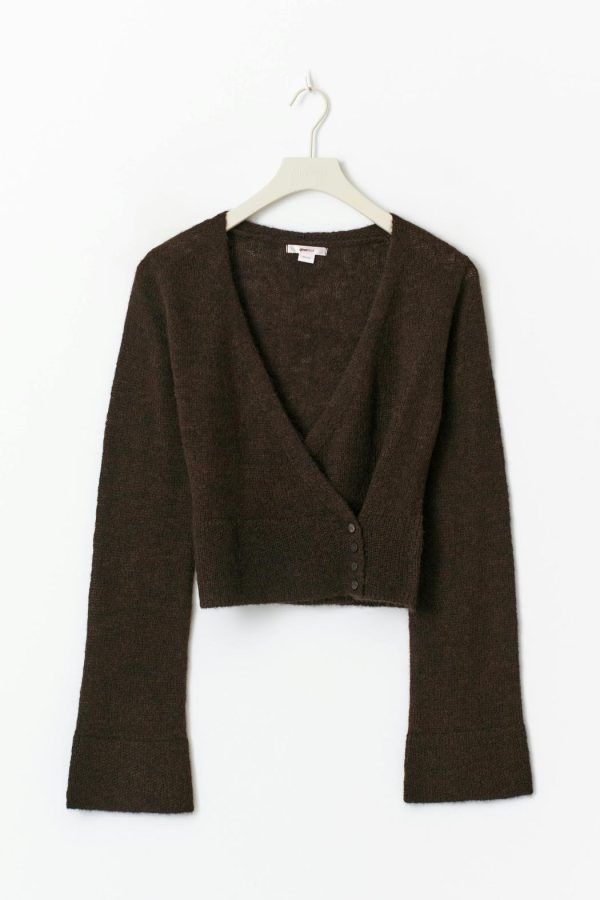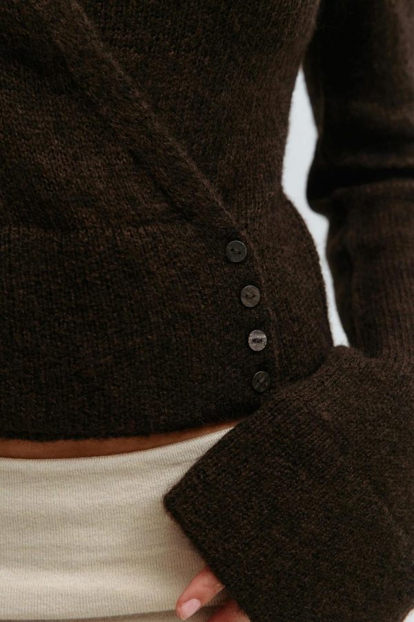 Stickad tröja med omlottdesign. Tröjan är brun och har croppad längd. Den har v-ringning, lång ärm, knappar framtill, normal passform och ribbstickade kanter.