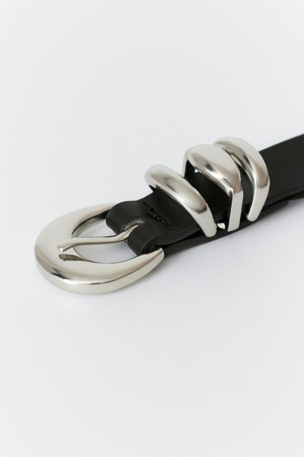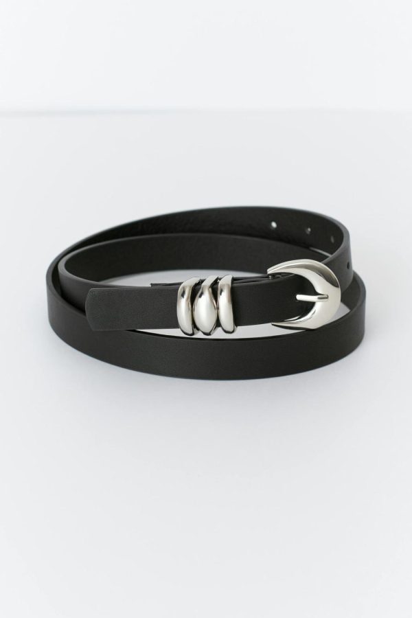 Bälte i läderimitation med ett silverfärgat metallspänne. Bältet är svart.