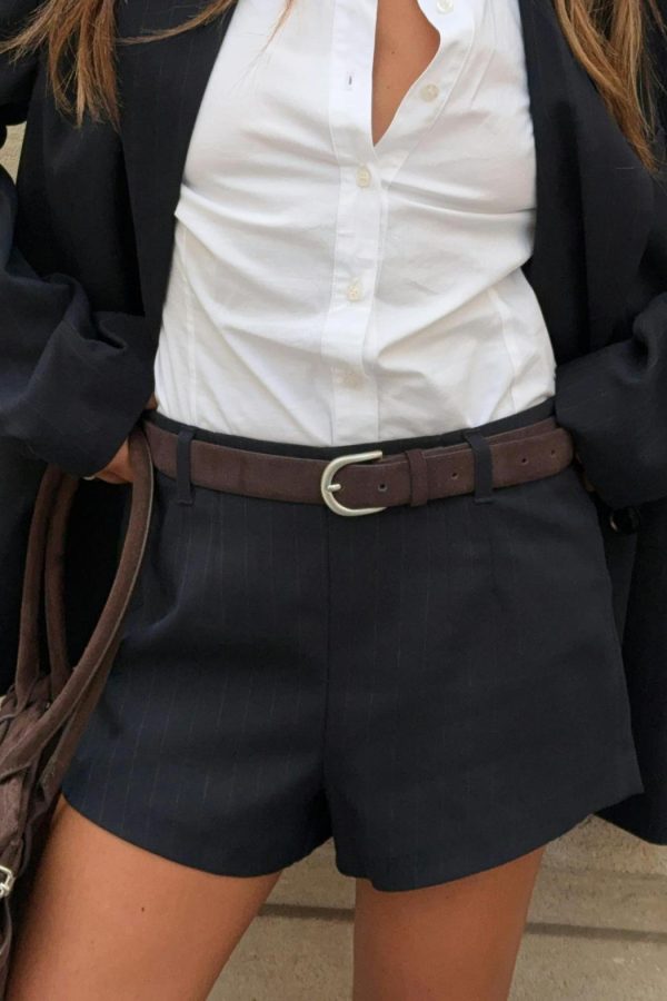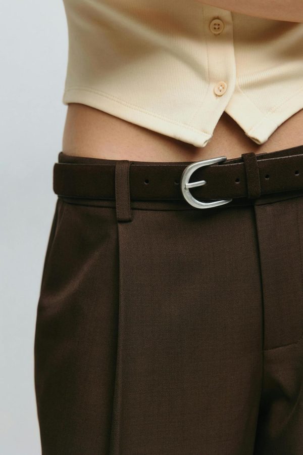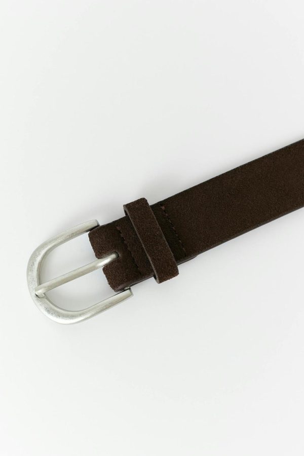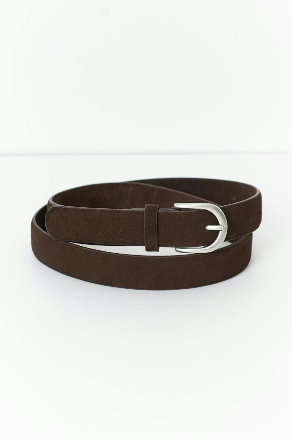 Bälte i mocka med silverfärgat metallspänne. Bältet är mörkbrunt.