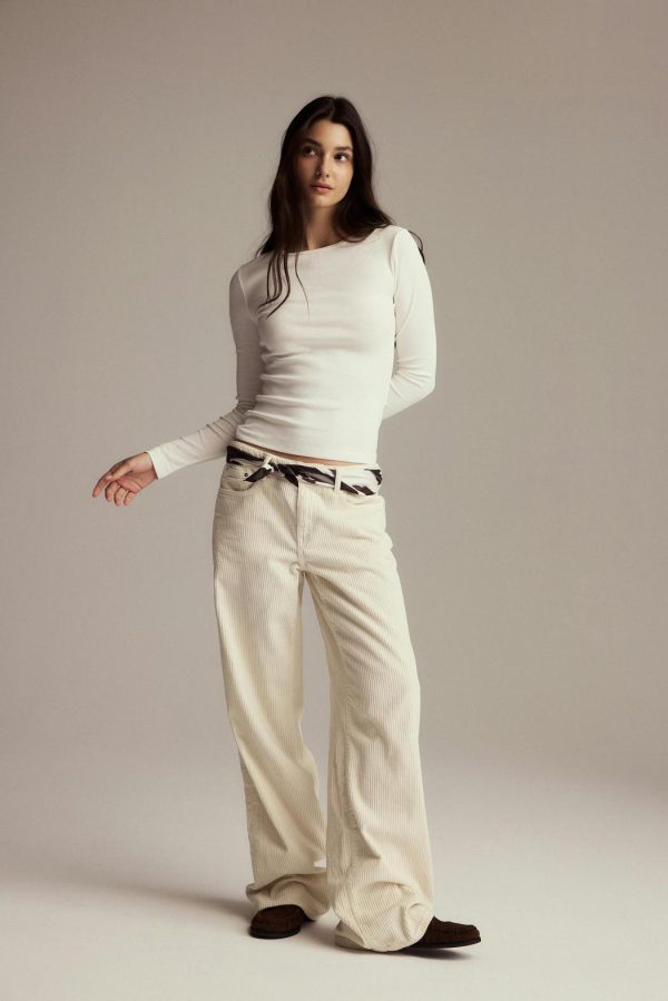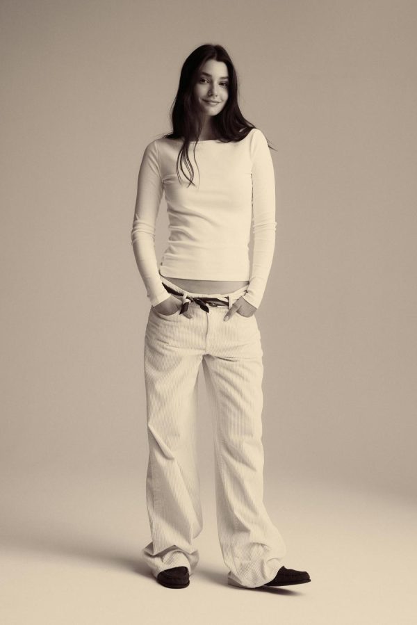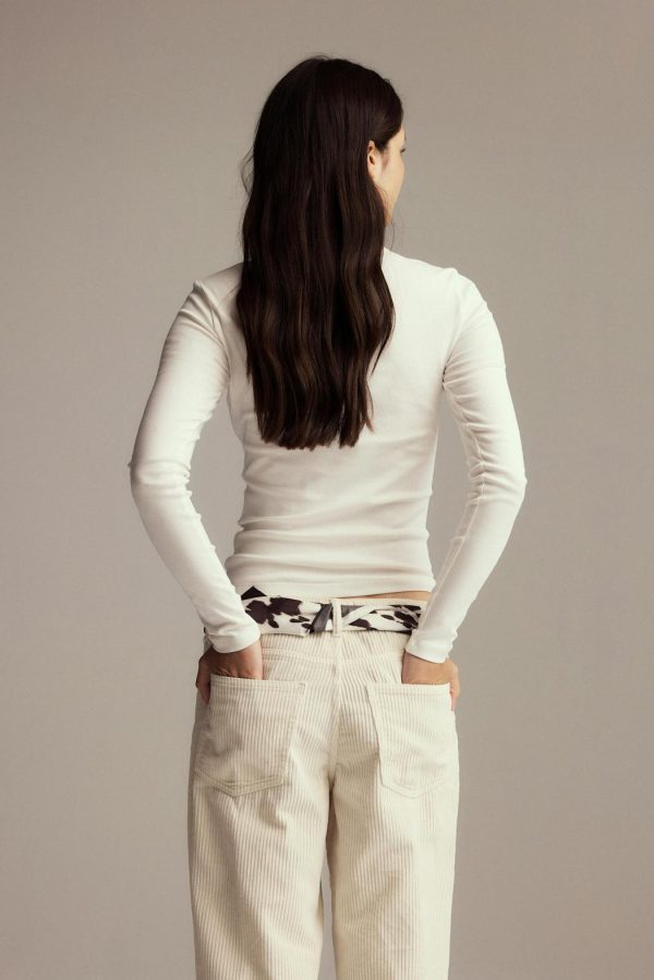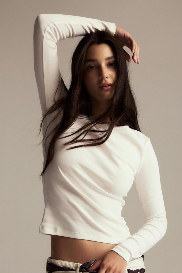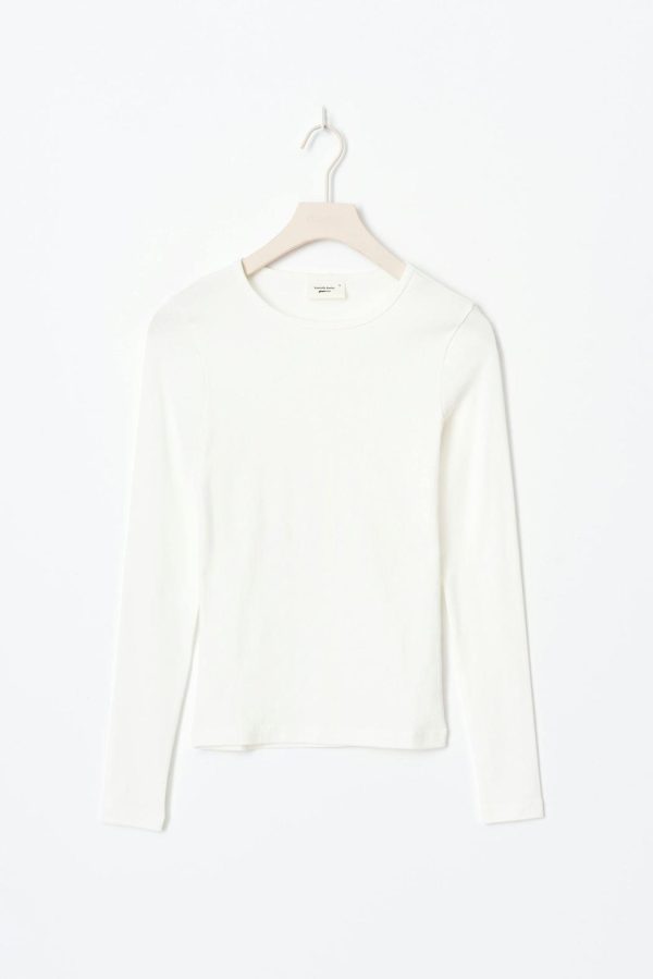 Långärmad topp med ribbad kvalitet. Toppen är vit och har figurnära passform. Den har rund halsringning och normallängd.
