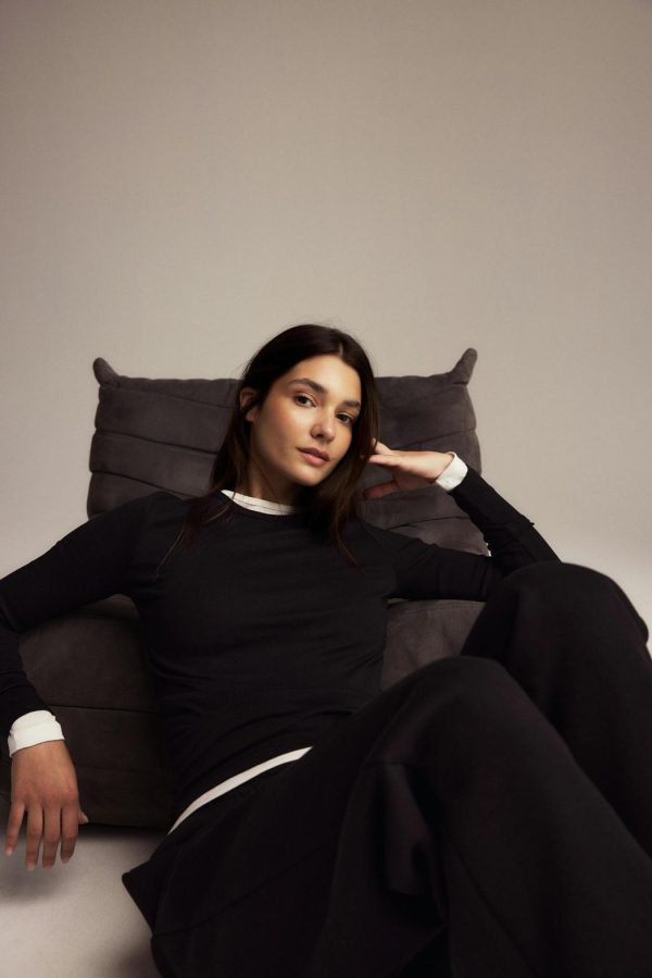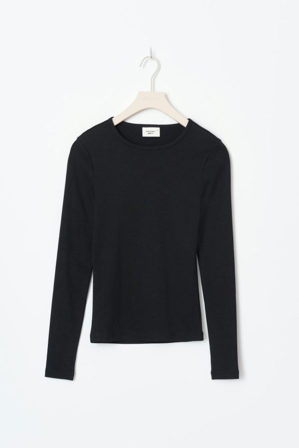 Långärmad topp med ribbad kvalitet. Toppen är svart och har figurnära passform. Den har rund halsringning och normallängd.