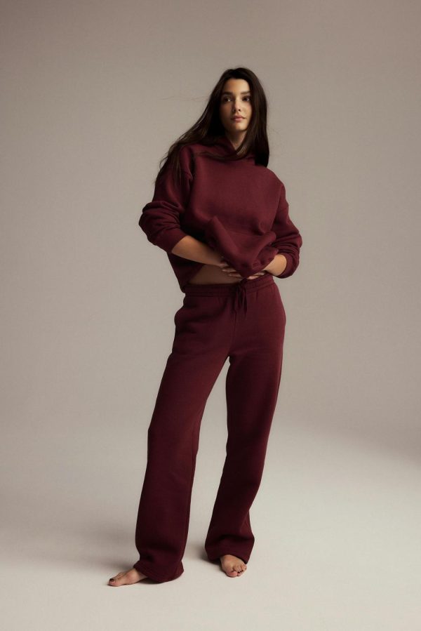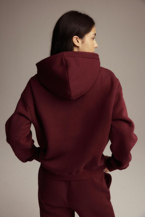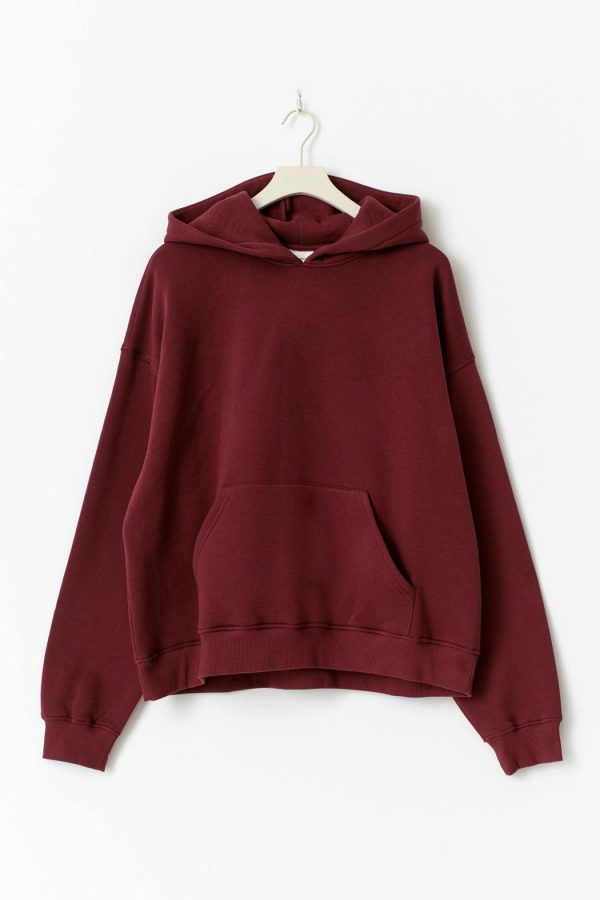 Oversized hoodie med känguruficka framtill. Hoodien är vinröd och har fodrad huva med dragsko. Den har nedhasade axlar och ribbad mudd vid ärmslut och i nederkant.