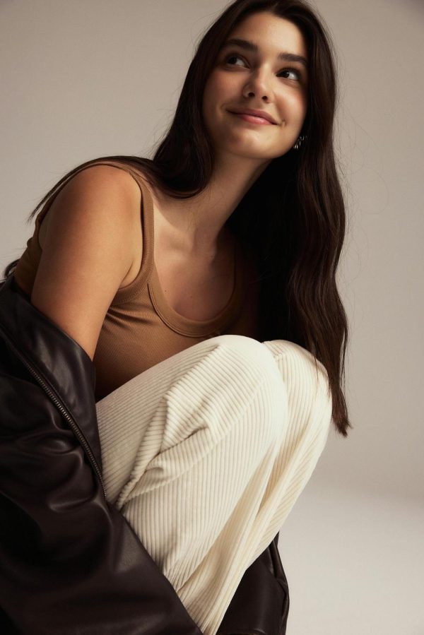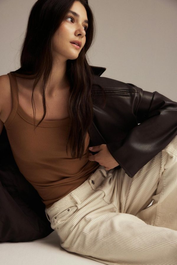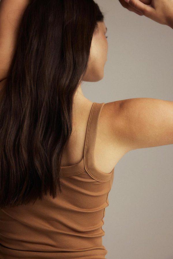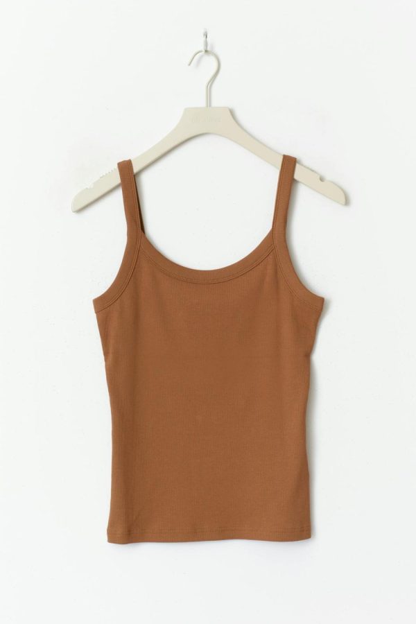 Ribbat linne i trikå med figurnära passform. Linnet är brunt och har ribbade axelband. Det har normallängd och ärmlös design.