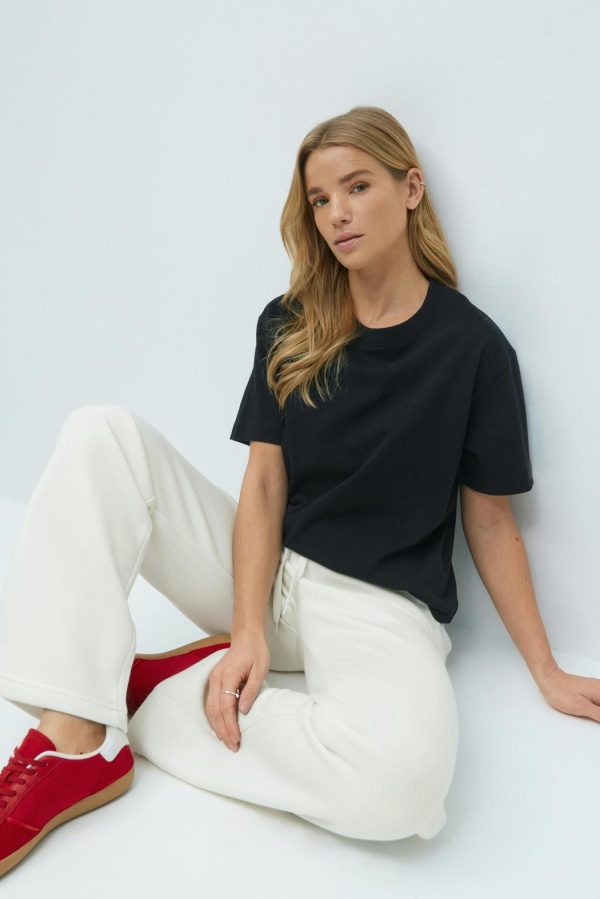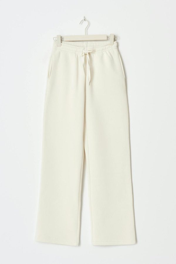 Mjukisbyxor med normal passform. Byxorna är beigea och har fickor i sidorna. De har raka ben och resår i midjan med knytning framtill.