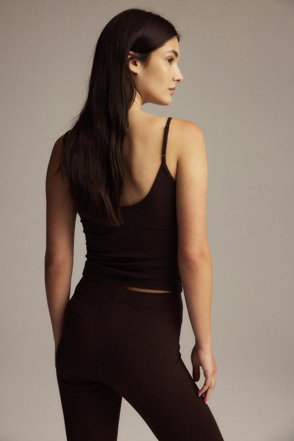 Linne i mjuk trikå med figurnära passform. Linnet är brunt och har tunna, elastiska axelband. Det har normallängd och djup halsringning.