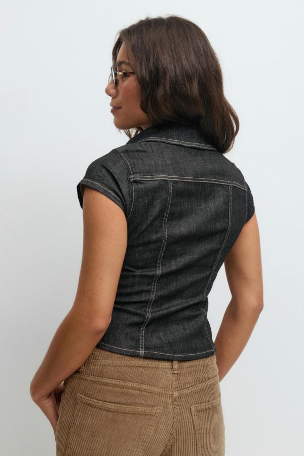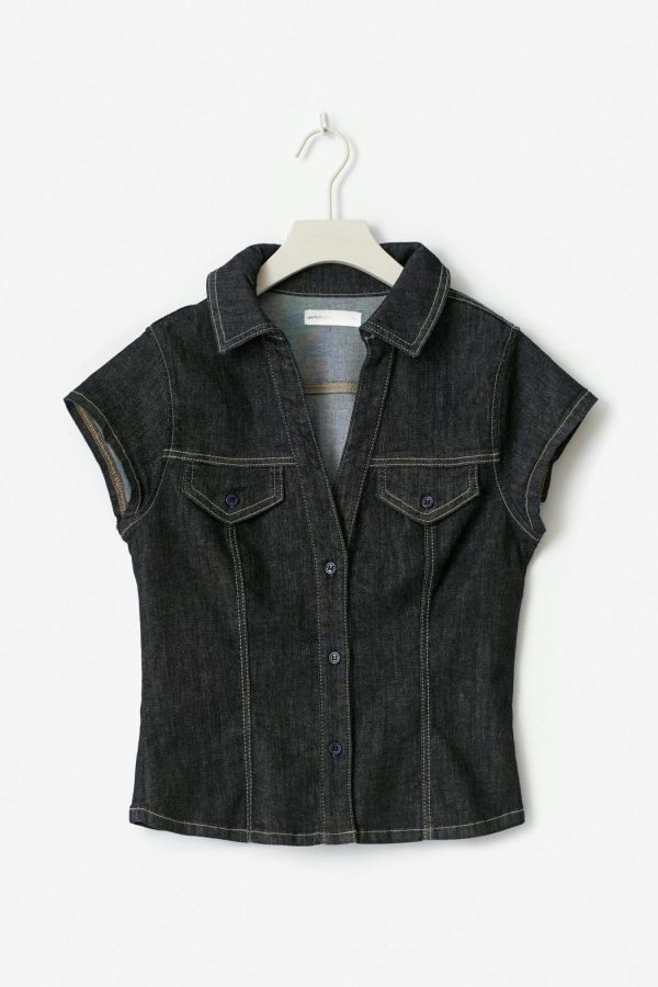 Figursydd jeansskjorta med korta ärmar. Skjortan är mörkblå och har framfickor med lock. Den har knappar fram och stretch.