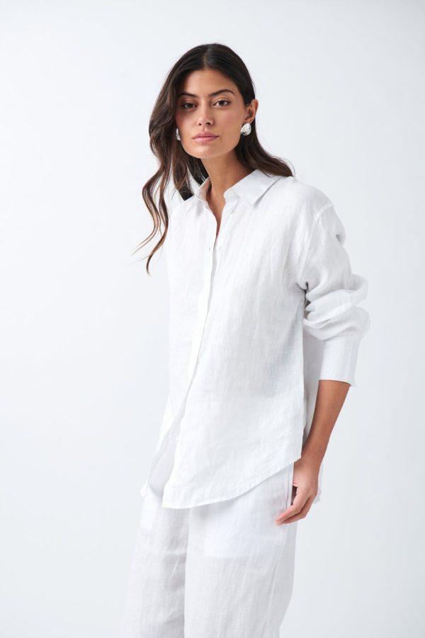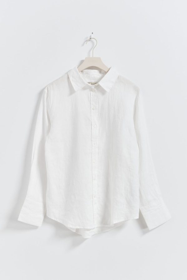 Linneskjorta med oversize fit. Skjortan är vit och har knäppning fram. Den har krage, okavskärning med veck bak och lång ärm med knapp och manschett.