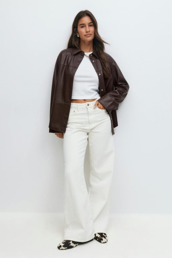 Skjorta i läderimitation med oversize fit. Skjortan är brun och har en bröstficka. Den har långa ärmar, dekorativa sömmar fram och bak och en rund halsringning med en krage.