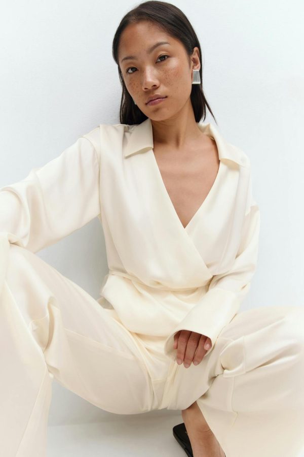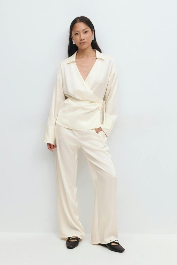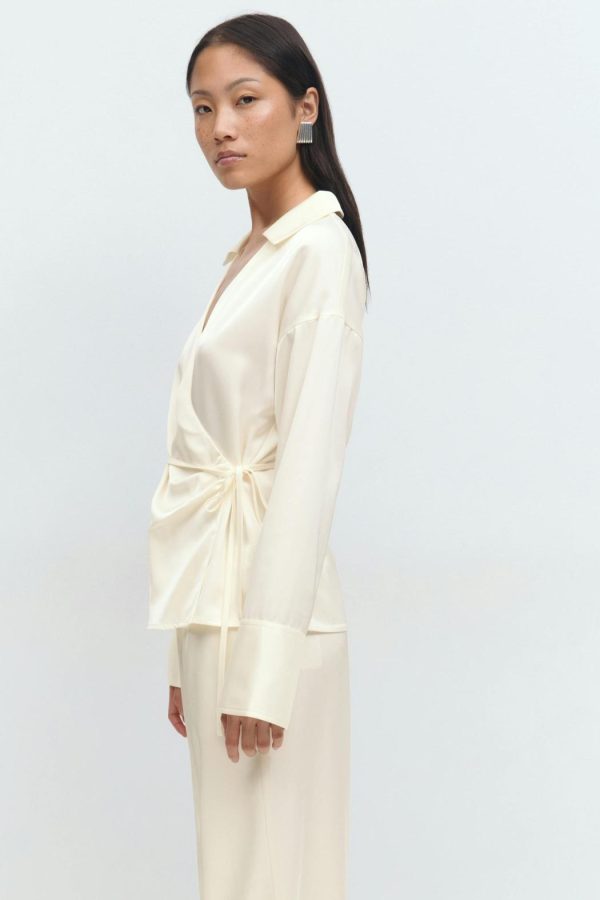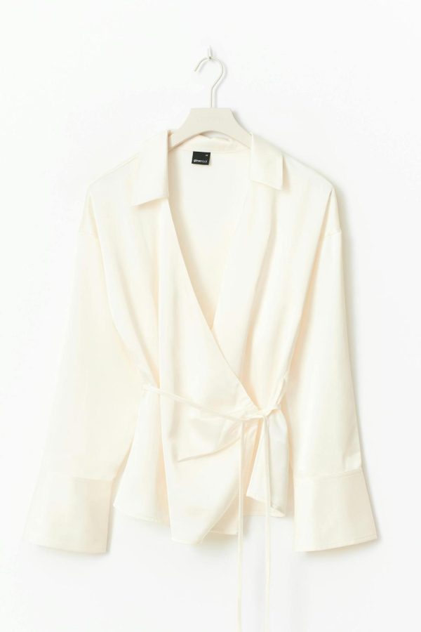 Skjorta med knytning i midjan. Skjortan är krämfärgad och har omlottdesign. Den har v-ringning, krage, normal passform och lång ärm med manschett.