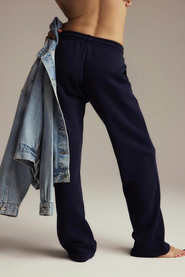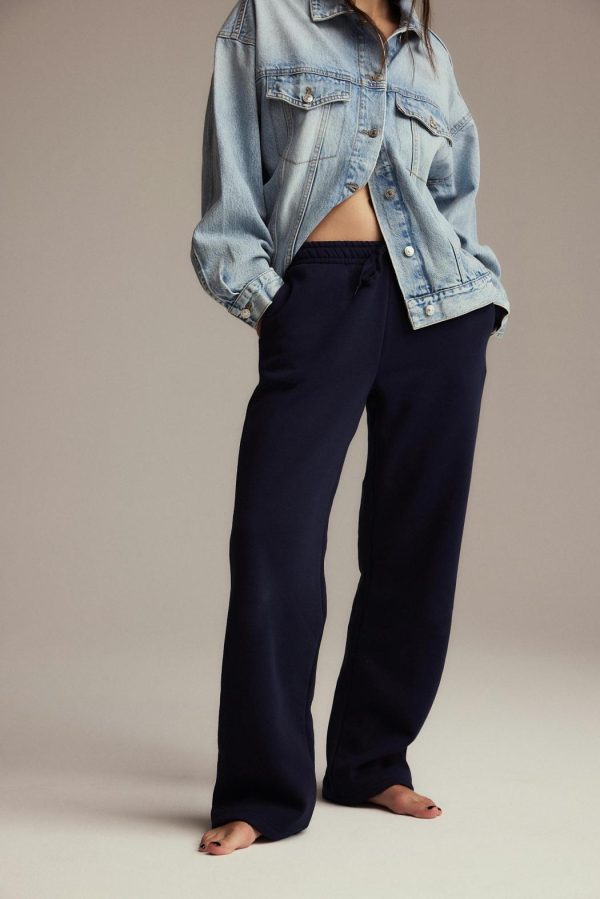 Mjukisbyxor med normal passform. Byxorna är blåa och har fickor i sidorna. De har raka ben och resår i midjan med knytning framtill.