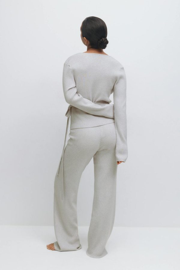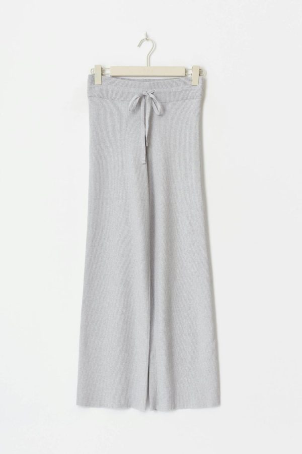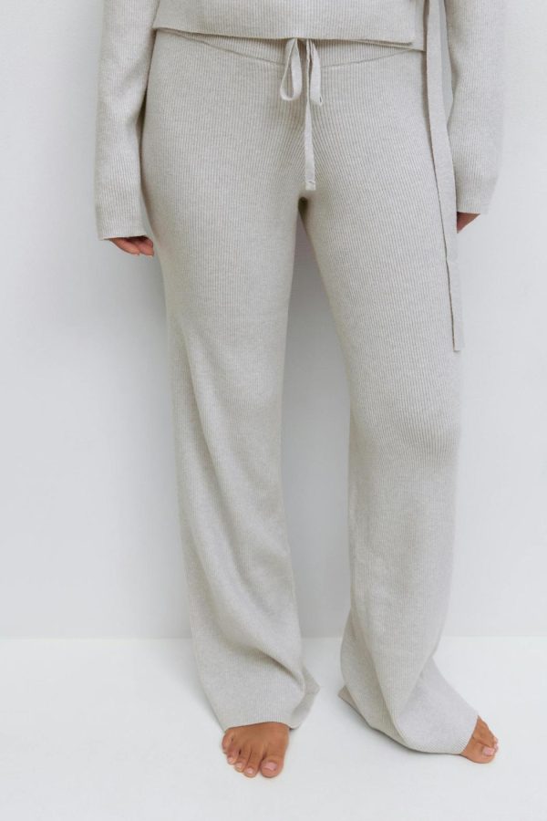 Stickade byxor med en ribbad kvalitet. Byxorna är gråa och har en normalhög midja. De har en normallängd, raka ben, en knytning i midjan och en ribbad linning.