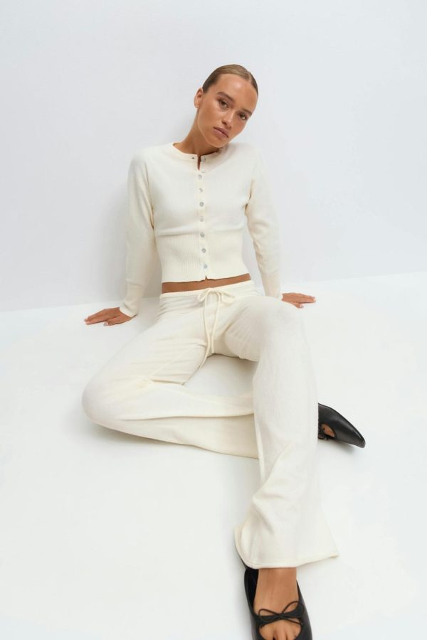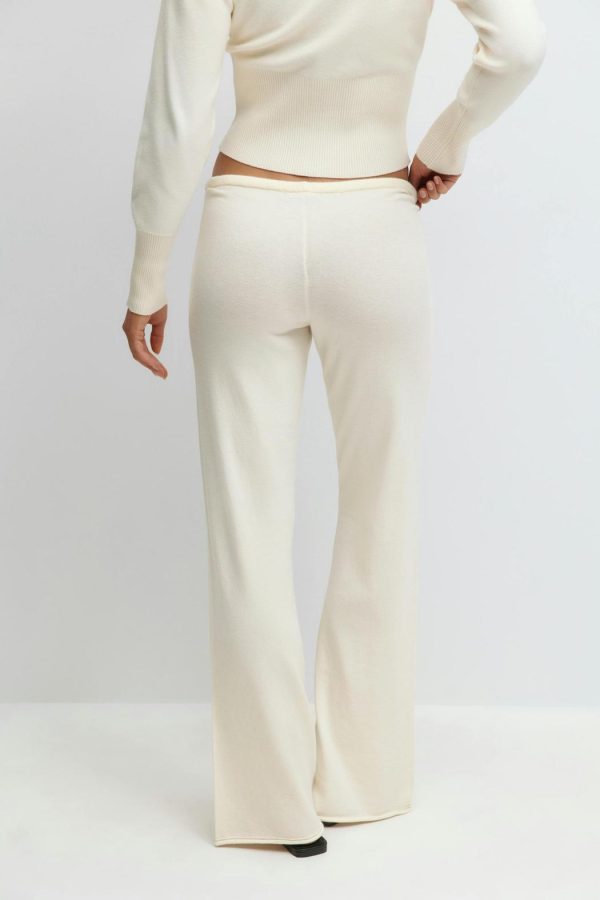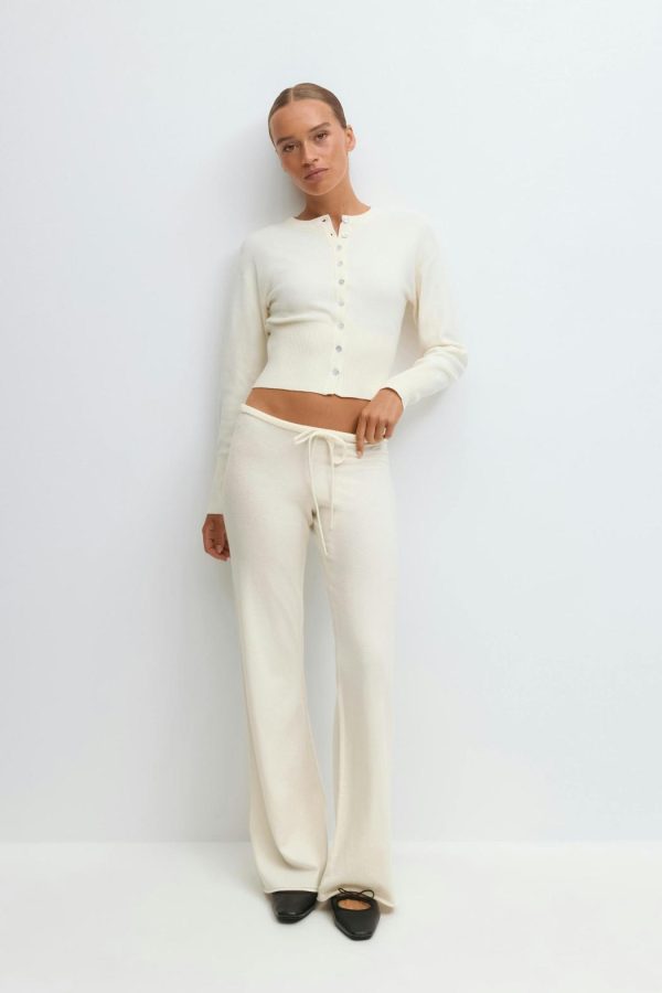 Stickade byxor med låg midja. Byxorna är naturvita och har knytning fram. De har utsvängda ben med fullängd och normal passform.