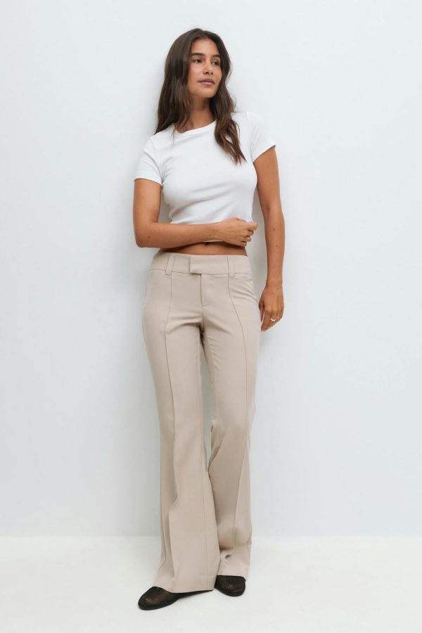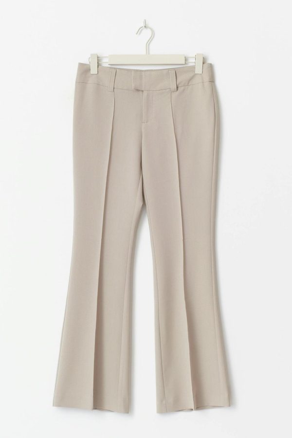 Lågmidjade kostymbyxor med utsvängda ben. Byxorna är ljusbeigea och har en ficka med lock bak. De har en dekorativ söm ner längs framsidan och en figurnära passform.