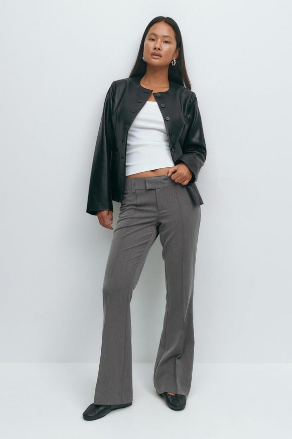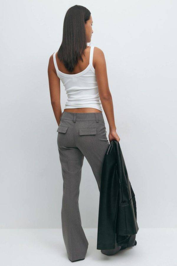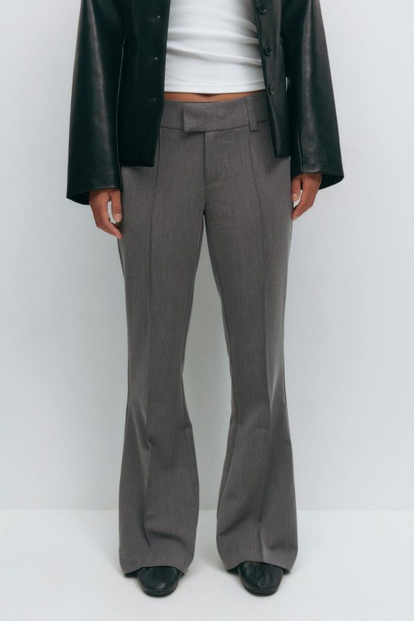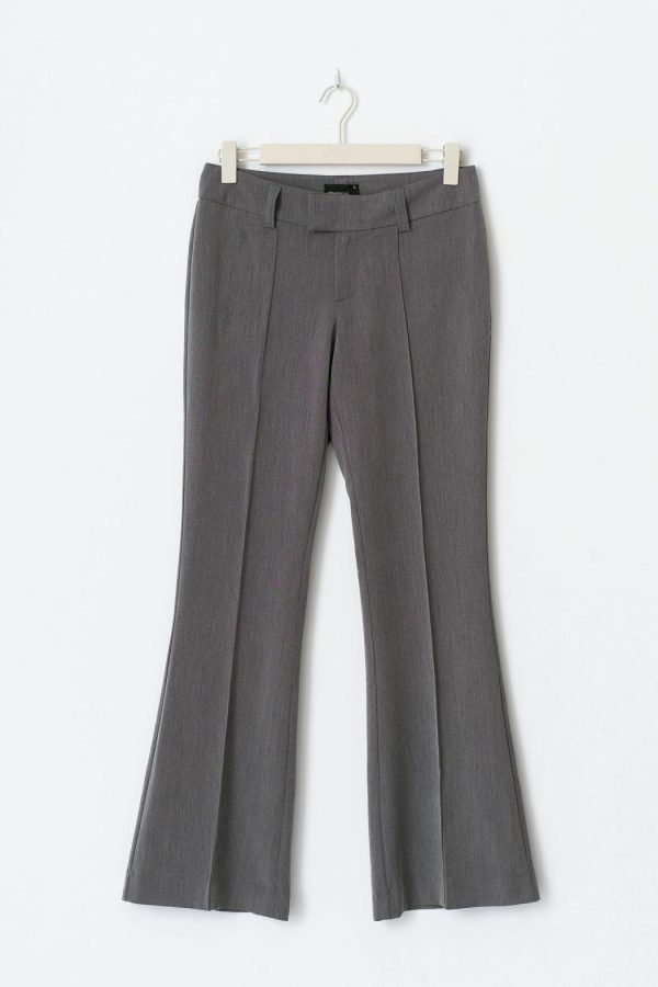 Lågmidjade kostymbyxor med utsvängda ben. Byxorna är gråa och har en ficka med lock bak. De har en dekorativ söm ner längs framsidan och en figurnära passform.