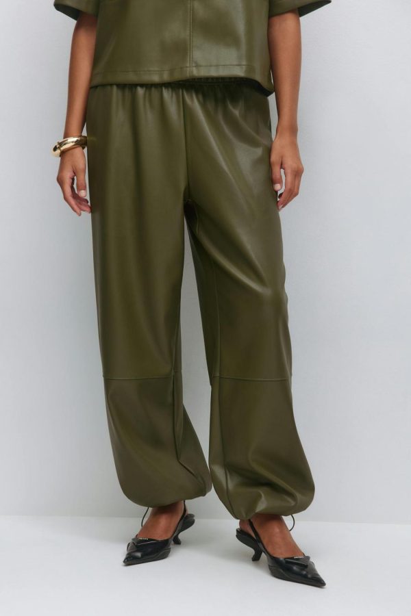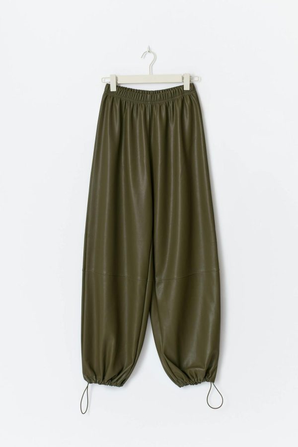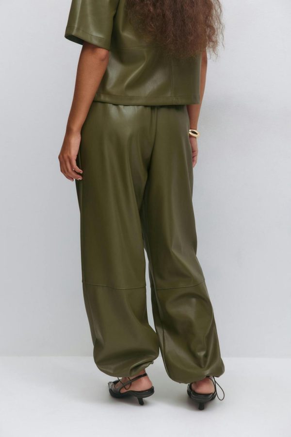 Ballongbyxor i skinnimitation med resår i midjan. Ballongbyxorna är gröna och har lös passform. De har stretchigt material och dragsko vid bensluten.