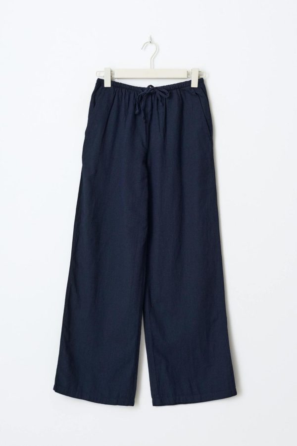 Linnebyxor med extra långa ben. Linnebyxorna är marinblåa och har medelhög midja. De har vida ben, sidofickor och resår i midjan med knytbar dragsko framtill. Passar för dig som är 175 cm eller längre.