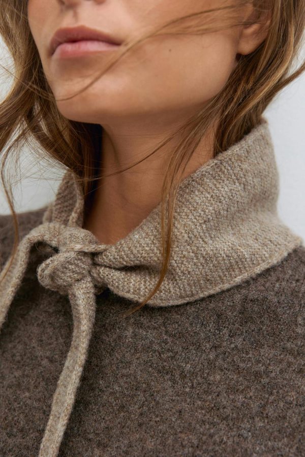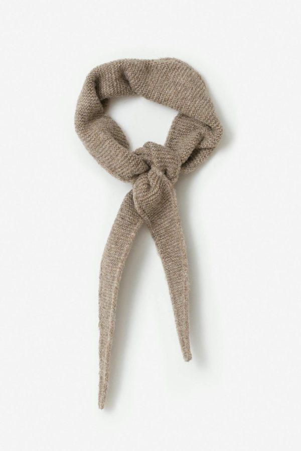 Liten scarf. Scarfen är ljusbrun och stickad.
