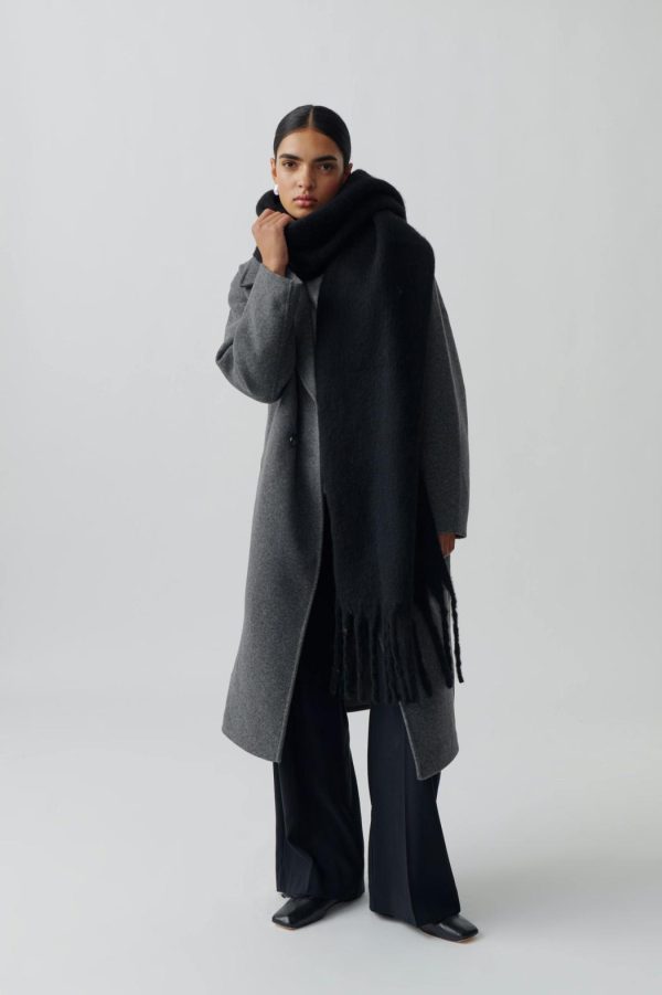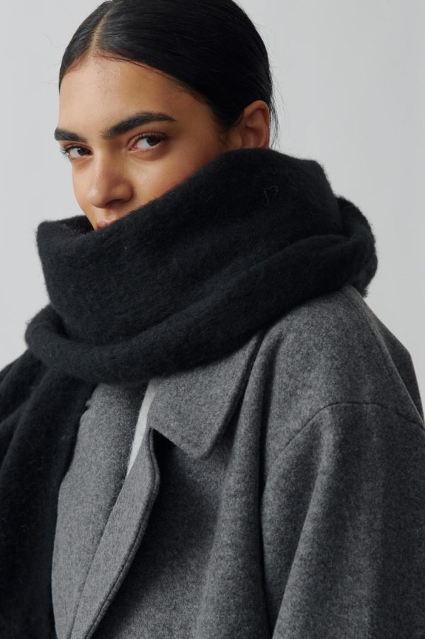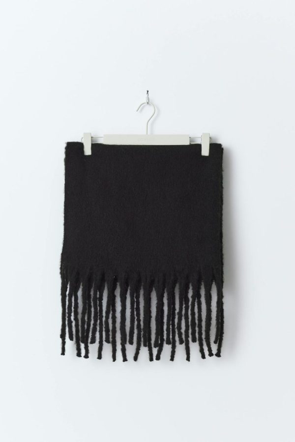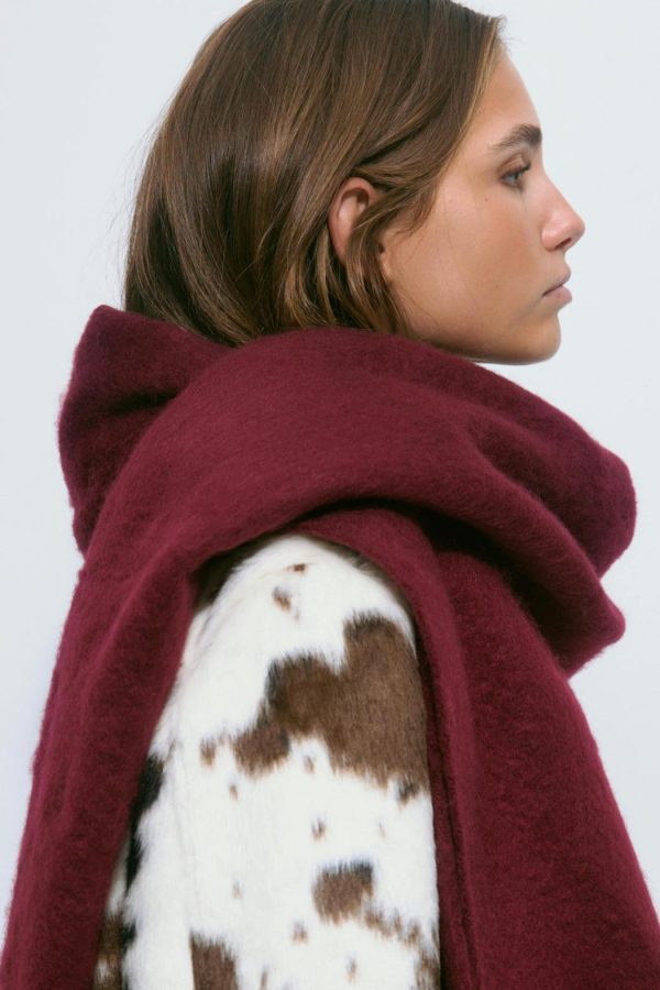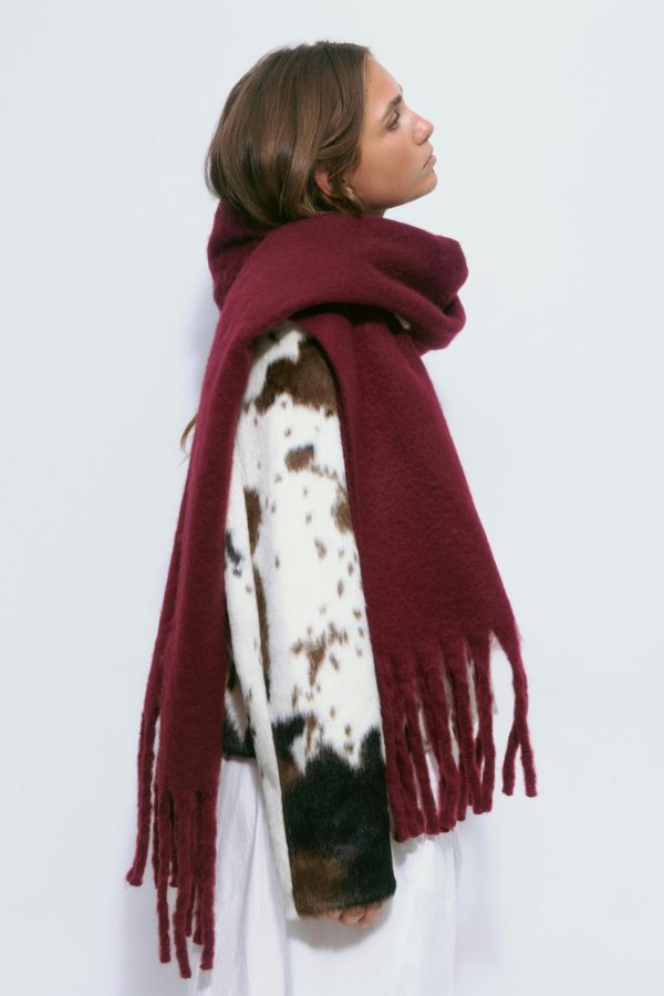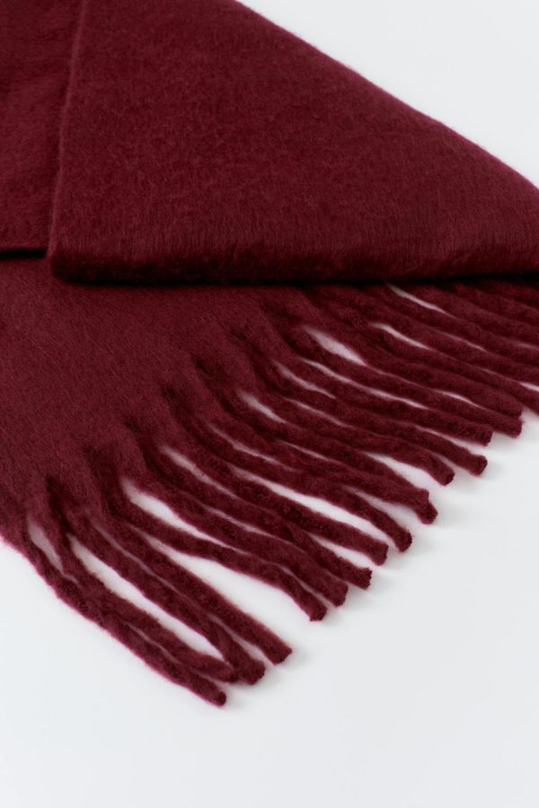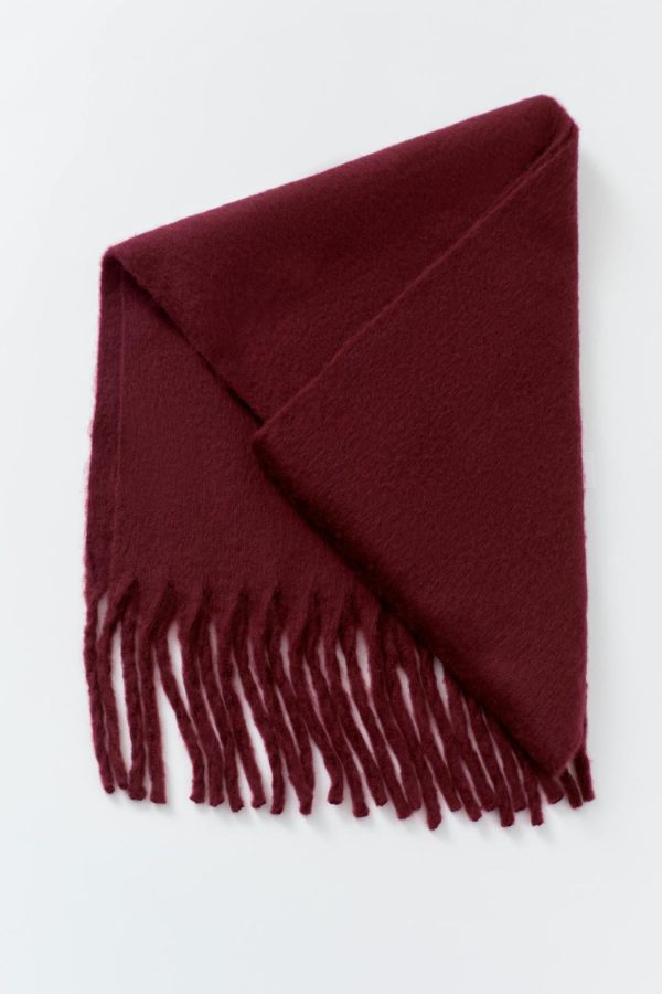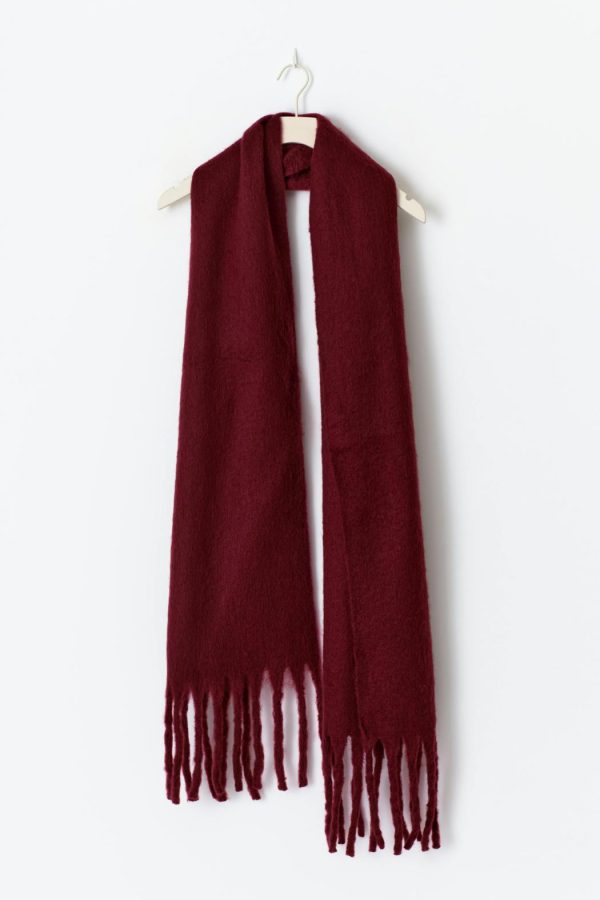 Stor halsduk med fransar längs kortsidorna. Halsduken är vinröd och har chunky fit.