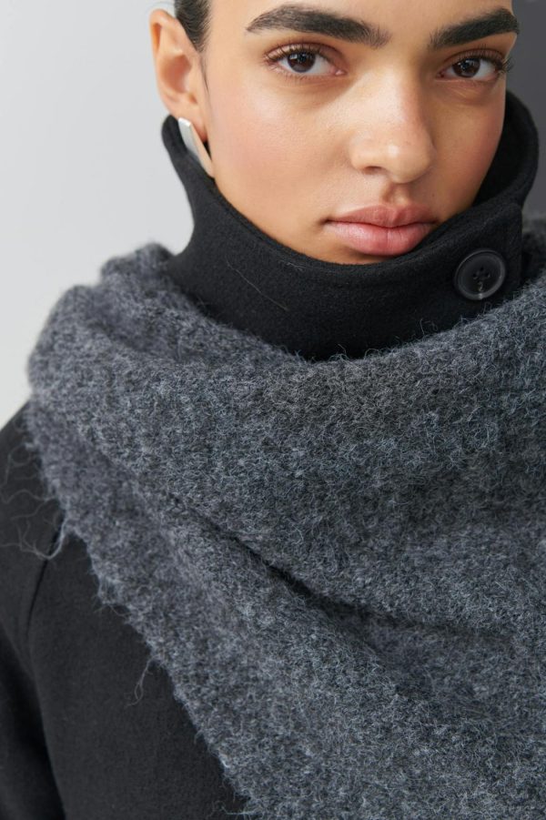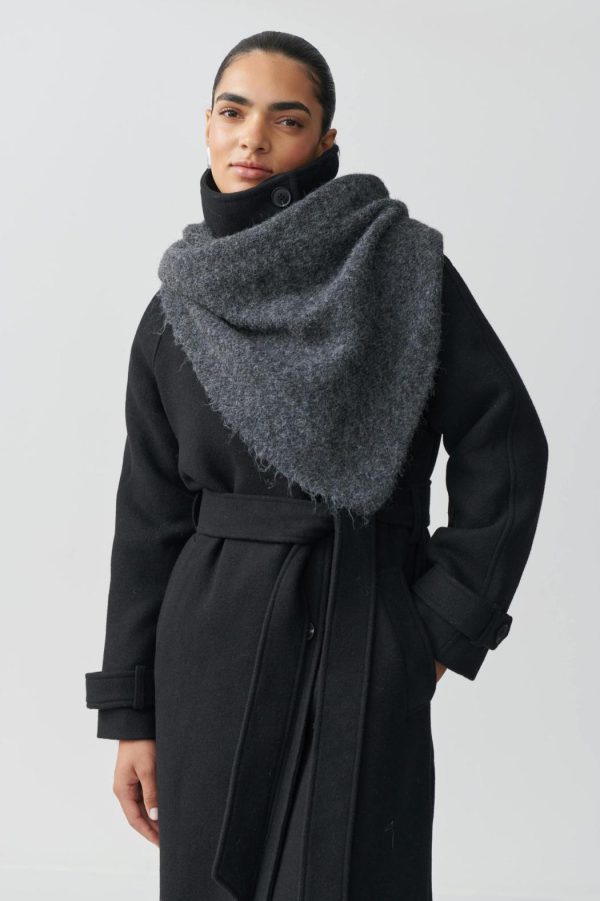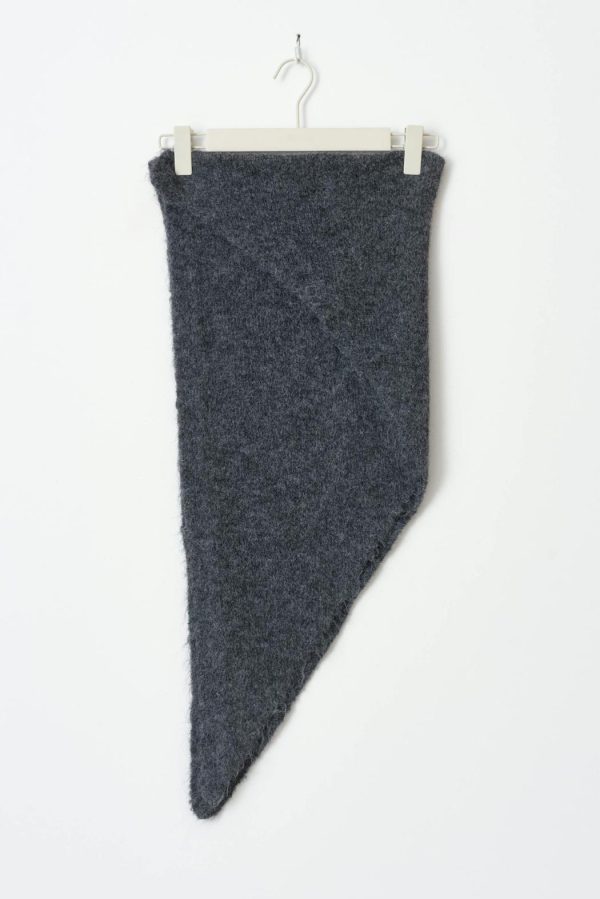 Triangelformad halsduk med mjuk, ribbstickad kvalitet. Halsduken är grå.