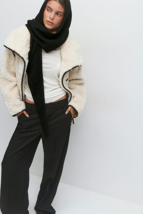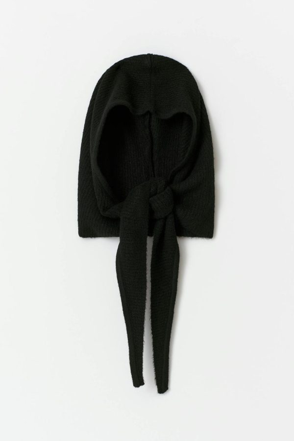 Stickad huva med knytband. Huvan är svart och har mjuk, ribbstickad kvalitet.