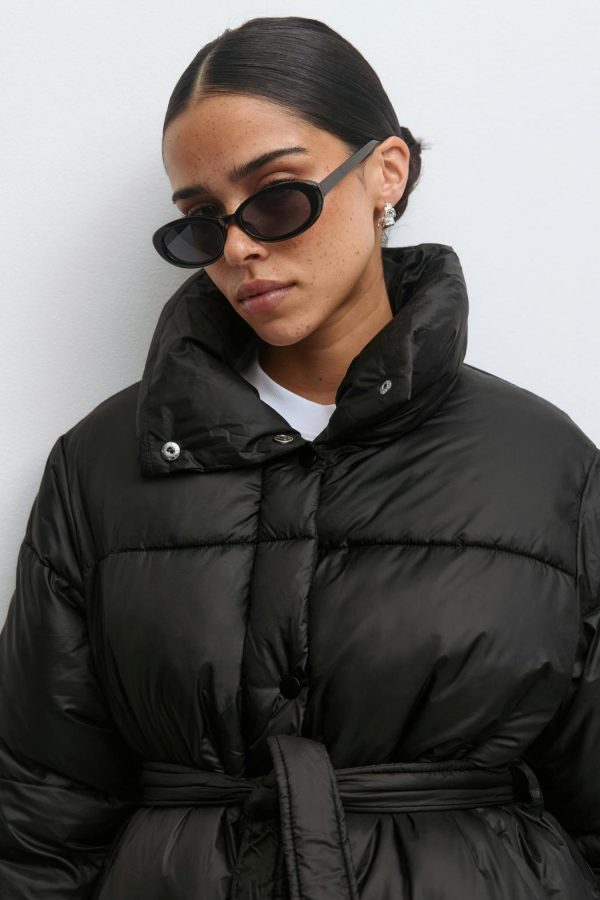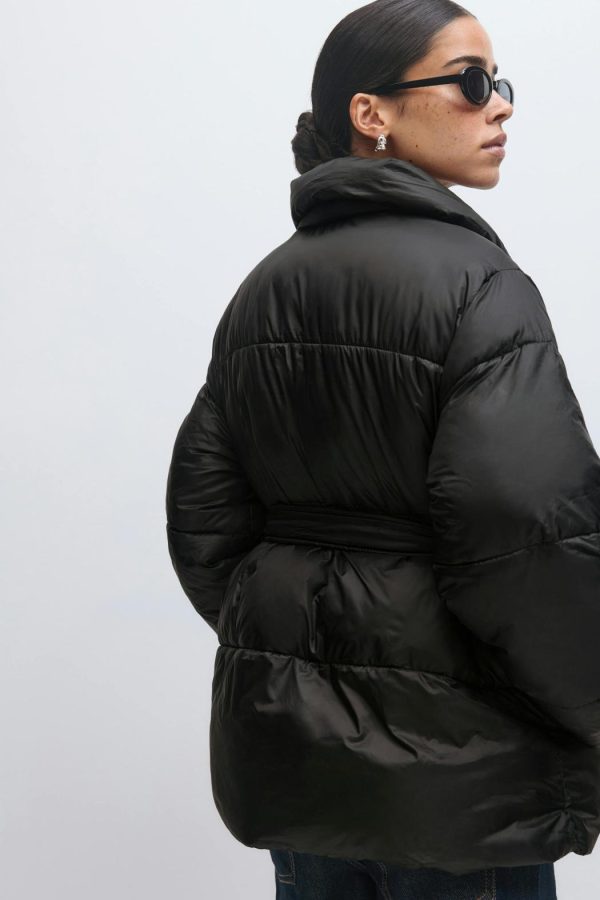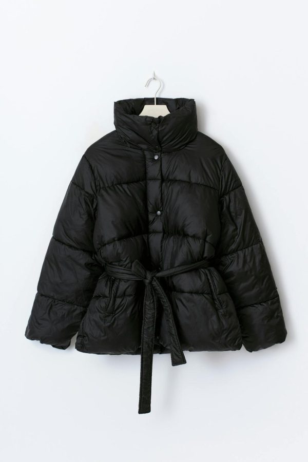 Pufferjacka med en hög krage. Jackan är svart och har en dragkedjestängning. Den har tryckknappar framtill, en lång ärm och fickor i sidorna.