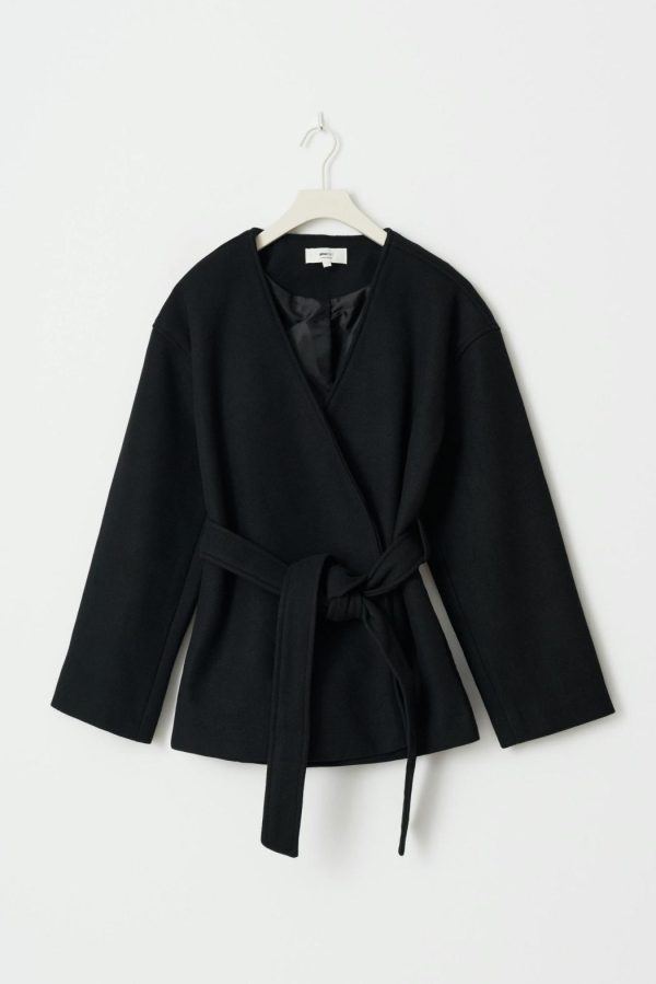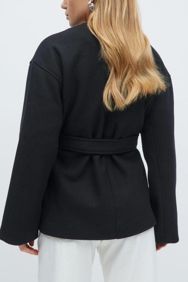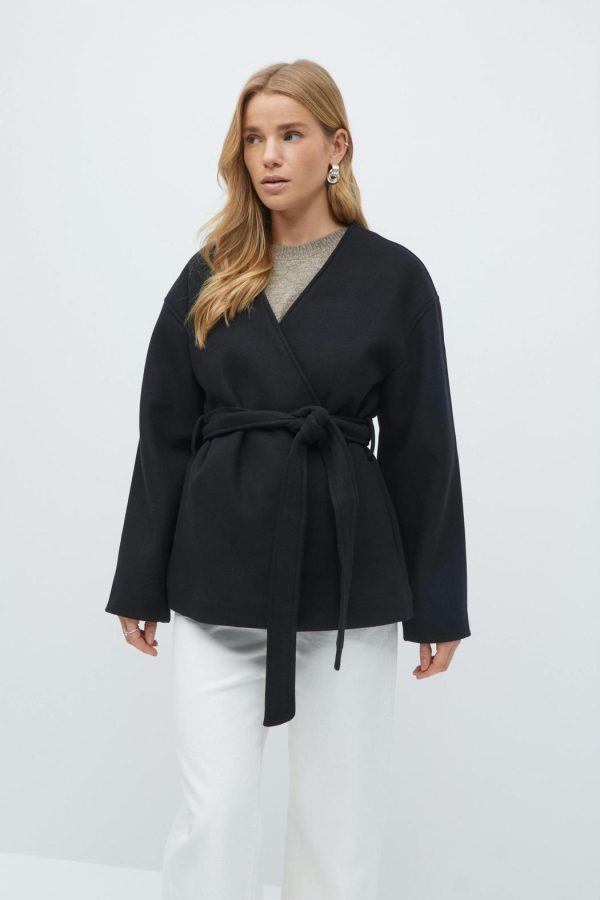 Kort kappa med knytskärp i midjan. Kappan är svart och har v-ringning. Den har oversize fit, lång ärm och fickor i sidorna. Helfodrad.