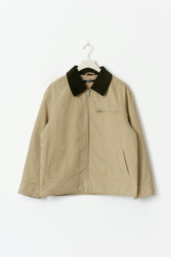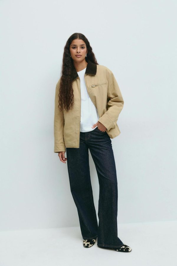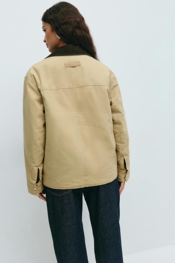 Kort cargojacka med krage i manchester. Jackan är beige och har bröstficka med dragkedja. Den har oversize fit, rund halsringning, lång ärm, dragkedjestängning framtill och knapp vid ärmslut. Fodrad.