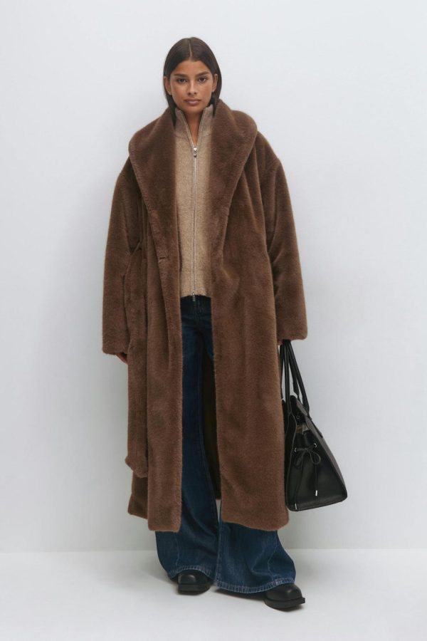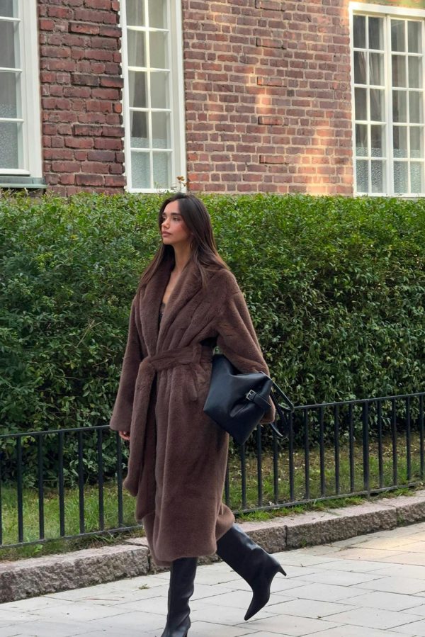 Lång pälsjacka i fuskpäls med knytskärp i midjan. Jackan är brun och har oversize fit. Den har fluffigt material, sjalkrage, långa ärmar, fickor i sidorna och hysk- och hakestängning framtill.